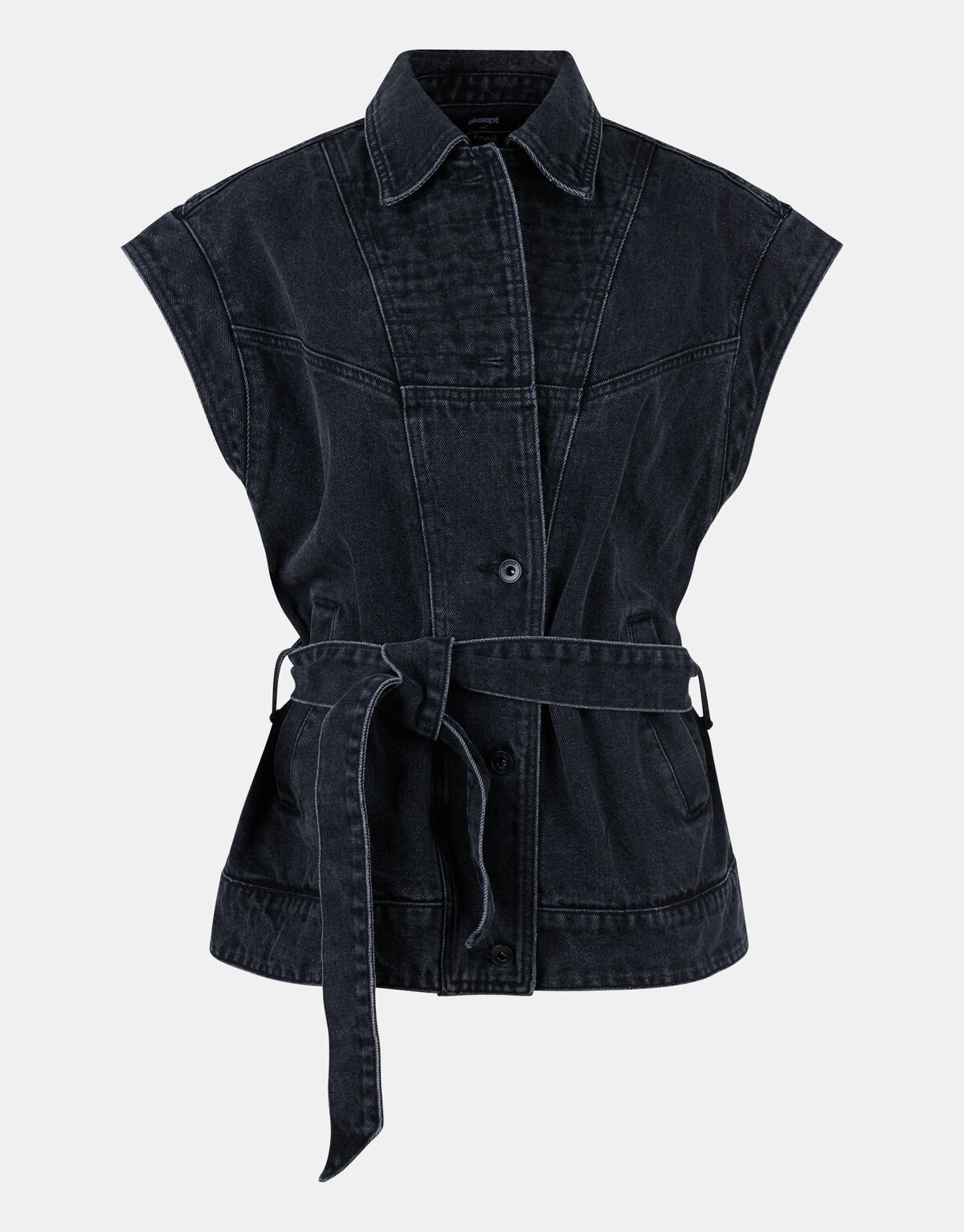 Het Sleeveless Jack is mouwloos, heeft een knoopsluiting, een kraag en een relaxed fit. Het item wordt gekenmerkt door een zwarte kleur en een denim stof. Verder heeft het jasje ook steekzakken en een band om de taille te accentueren. Combineer het item met een basic t-shirt en de Glam Chiffon rok uit dezelfde collectie voor een stralende look! Het model heeft een lengte van 177 cm en draagt maat S. Het artikel heeft een totale lengte van 70 cm bij maat S.