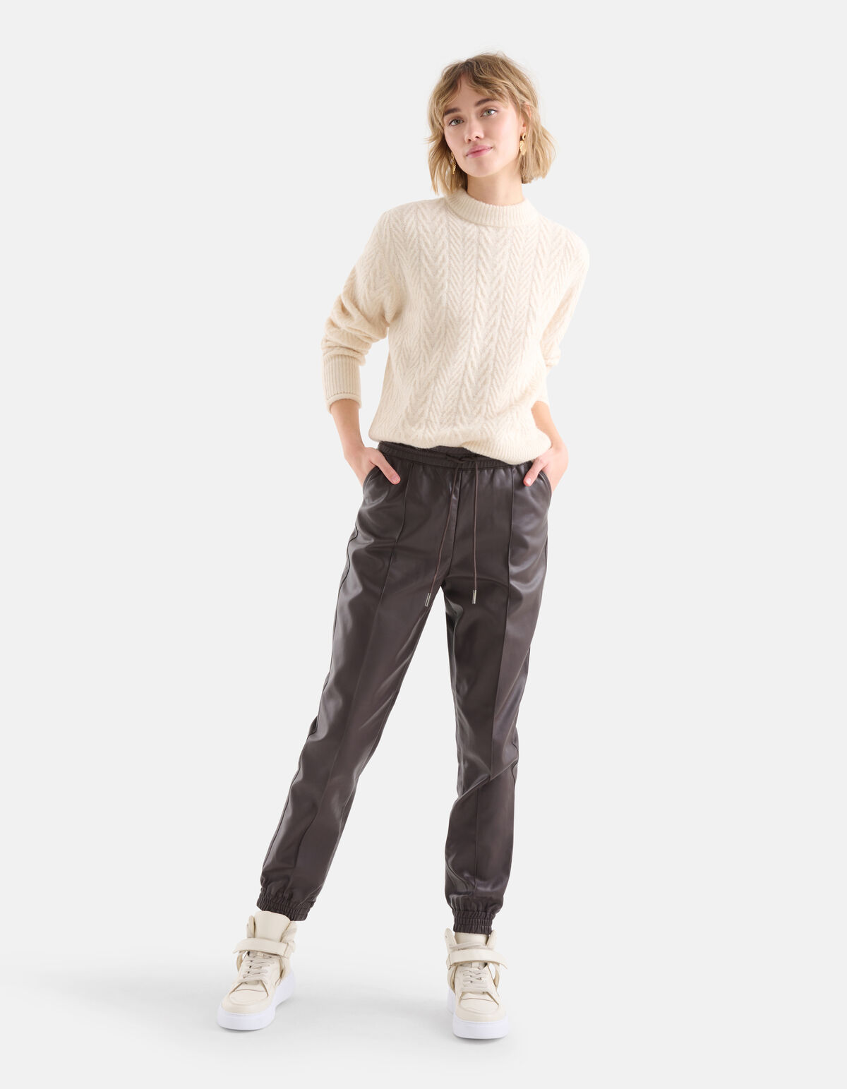 Vegan leer zie je ieder jaar weer terugkomen en wij snappen waarom. Het is niet meer weg te denken uit ons straatbeeld. De Vegan leren broek heeft een hoge taille, een elastieke band in de taille, steekzakken aan de voorzijde en paspelzakken aan de achterzijde. Het item wordt gekenmerkt door vegan leren kwaliteit, de donkerbruine kleur en elastiek aan de onderzijde van de broekspijpen. Verder heeft de broek nog een aansnoerkoord bij de elastieke band. Combineer het samen met een kabeltrui en sneakers voor een stijlvolle look! Het model heeft een lengte van 179 cm en draagt maat S. Het artikel heeft een binnenbeenlengte van 73 cm bij maat S.