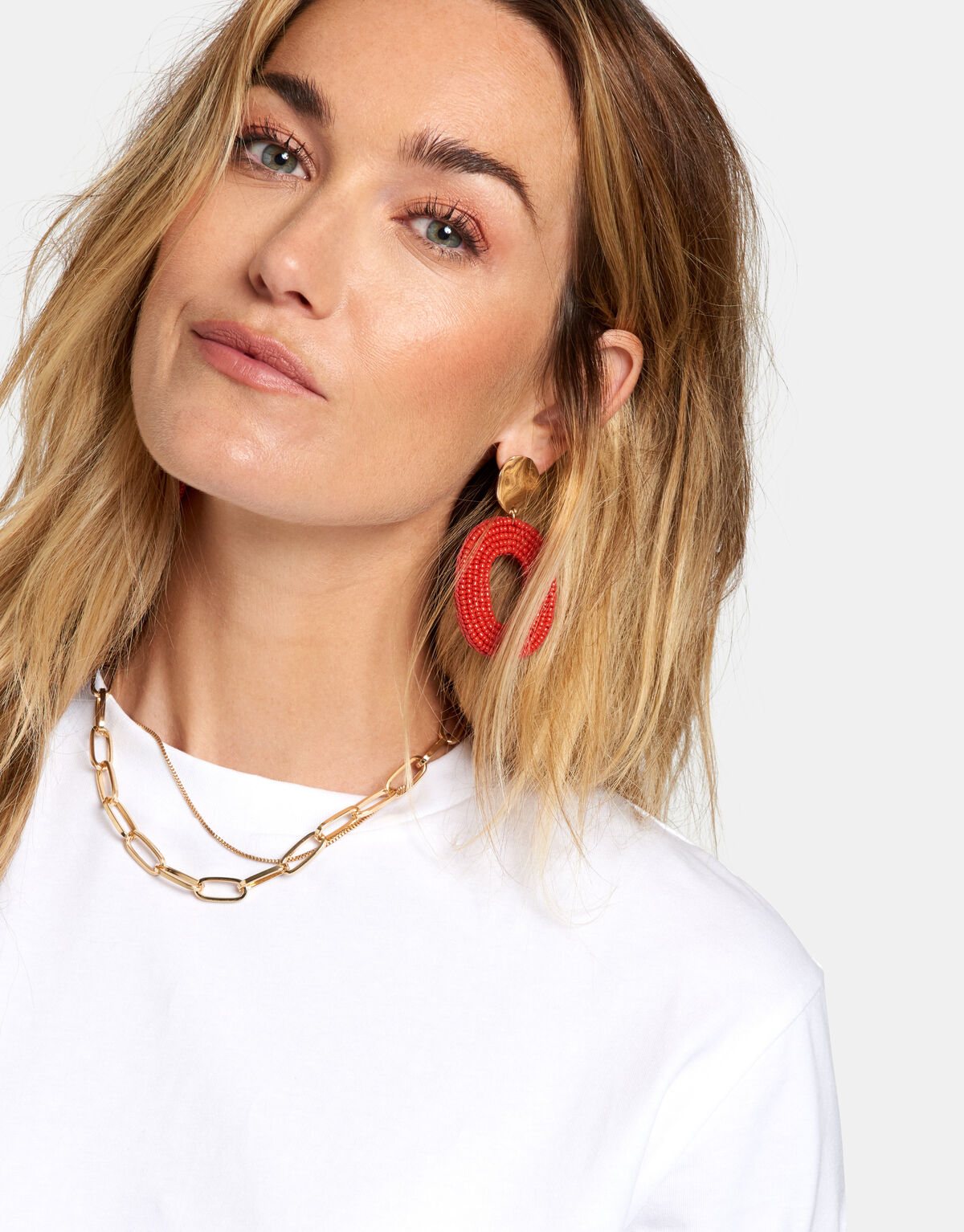 Het item dat in iedere garderobe thuis hoort: een wit basic T-shirt. Ideaal wanneer je voor een cleane minimalistische look wilt gaan maar ook de perfect afstyling voor een opvallende broek of rok. Het T-shirt heeft een rechte fit, korte mouwen en een ronde hals. Het item wordt gekenmerkt door het zachte maar stevige katoen en het kleine beetje elastaan wat ervoor zorgt dat de tee in perfecte vorm blijft. Het model heeft een lengte van 174 cm en draagt maat S. Het artikel heeft een totale lengte van 66 cm bij een maat S.