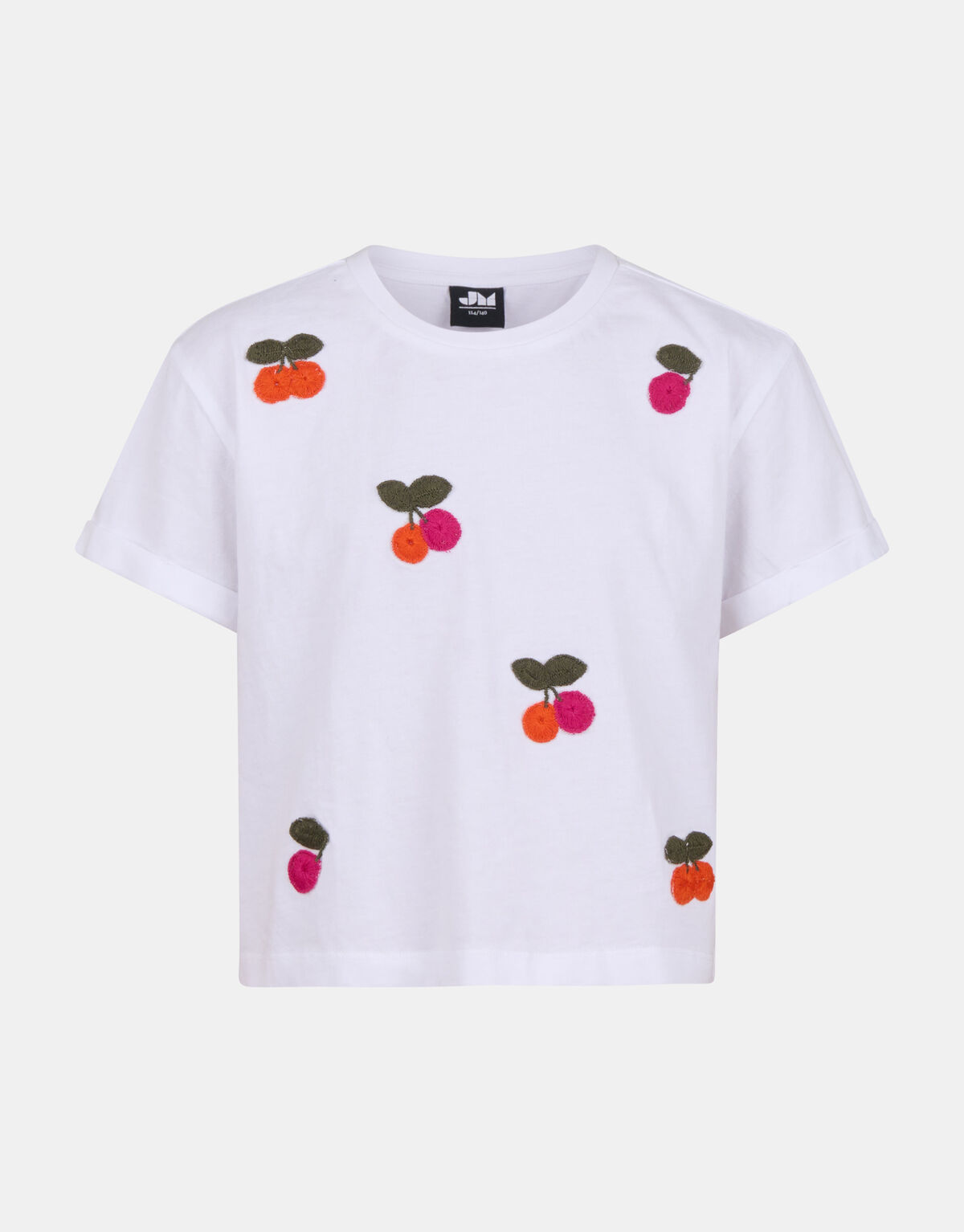 Cherry crush! Ga stoer de deur uit met het Crochet t-shirt. Het item heeft een korte mouw, een ronde hals en een relaxed fit. Het t-shirt heeft een ruimere fit, waardoor het lekker zit. Daarnaast is het t-shirt ook een korter model, waardoor het voor jouw kleine meid niet te kort of te lang valt. Verder wordt het item gekenmerkt door een witte kleur en een all-over geborduurde kersen print op de voorzijde. Maak je look helemaal af door het item te combineren met jouw favoriete shortje.