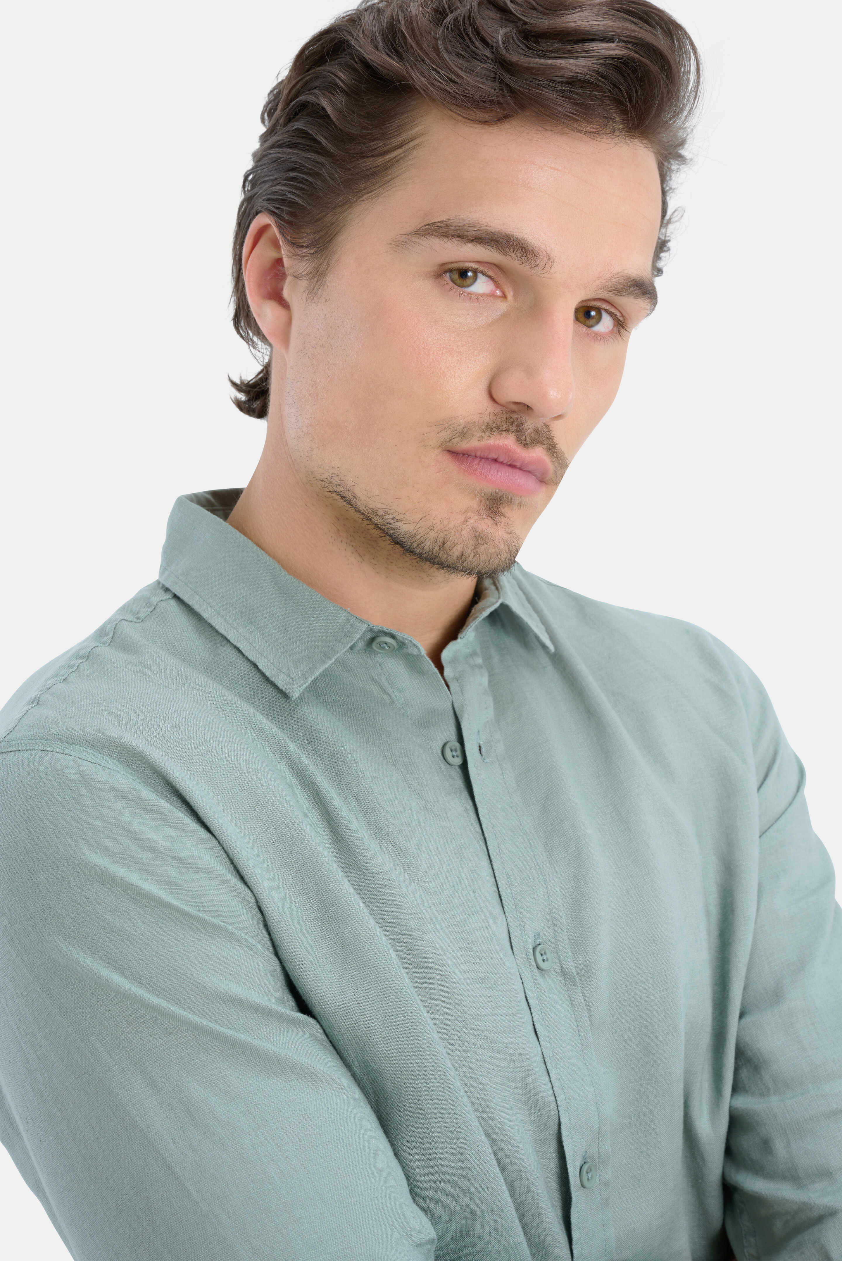 Het perfecte overhemd als jij van comfortabele kleding houdt! Het Linnen overhemd is namelijk gemaakt van 100% van linnen stof. Het item heeft lange mouwen, een rechte fit en een blousekraag. Daarnaast wordt het item gekenmerkt door de groene kleur en de knoopsluiting aan de voorzijde. Combineer het overhemd samen met een lichte jeans of korte broek in het voorjaar voor een basic lookje! Het model heeft een lengte van 184 cm en draagt maat M. Het artikel heeft een totale lengte van 81 cm bij maat M.