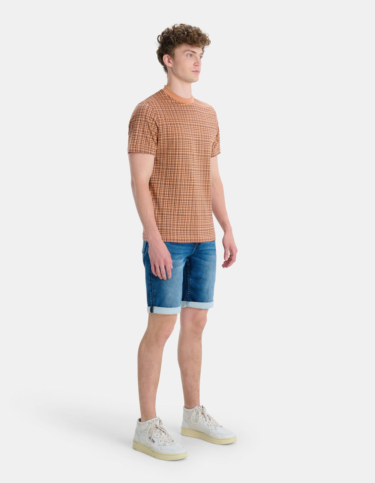 Trend alert! Het Frame T-shirt heeft een korte mouw, een ronde hals en een regular fit. Het item wordt gekenmerkt door een oranje kleur met een all-over ruitjes design in een zwarte kleur. De ruitjes zijn subtiel, doordat de strepen gemaakt zijn van een dunne lijn. Combineer het t-shirt samen met een denim short voor een zonnige zomerdag! Het model heeft een lengte van 185 cm en draagt maat M. Het artikel heeft een totale lengte van 72 cm bij maat M.