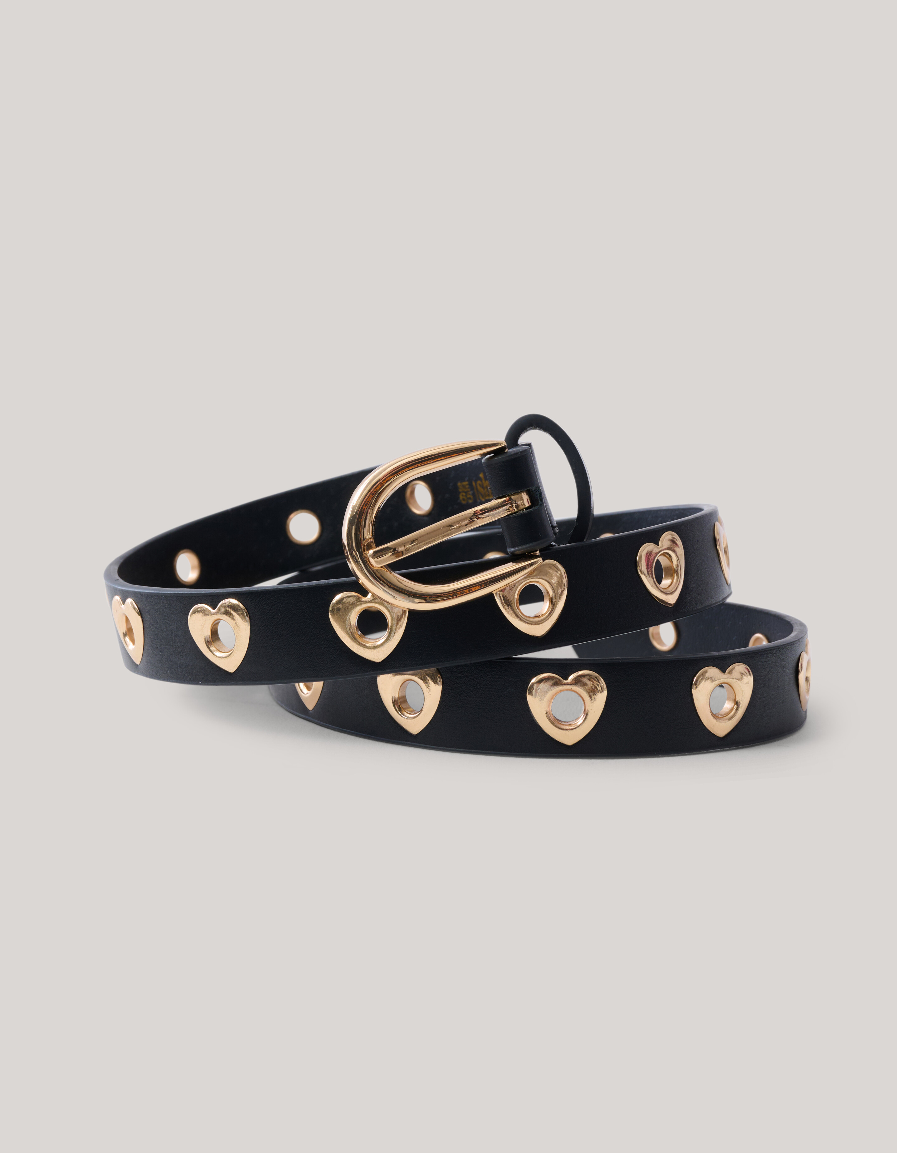 Van de Gouden Heart Riem word je opslag verliefd! De riem wordt gekenmerkt door een zwarte kleur met studs all-over de riem. De studs zijn in de vorm van een hart en hebben een gat in het midden, hierdoor kan je de riem op meerdere standen sluiten. Verder heeft de riem nog een bijpassende gouden gesp. Het item heeft een breedte van 1,9 cm. De standaard lus lengte van een jeans is 3,8 cm.