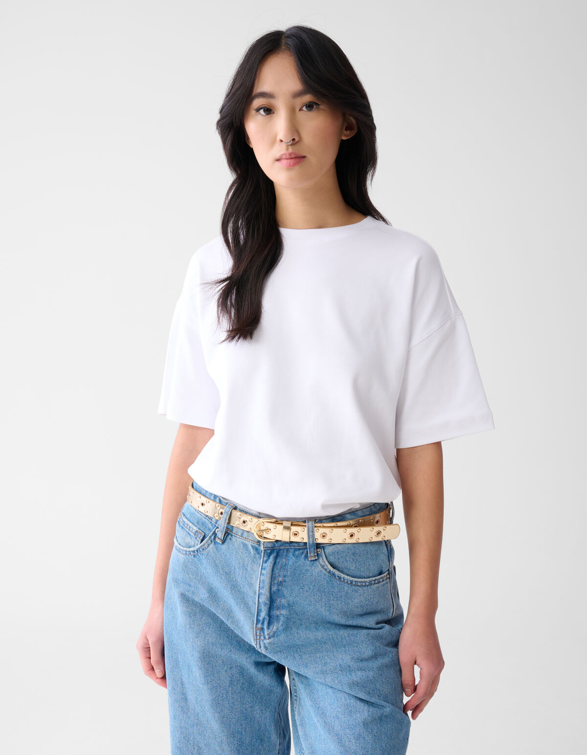 Voeg een vleugje glamour toe aan je outfit met deze stijlvolle riem. Gemaakt van hoogwaardig materiaal met een elegante gouden gesp en studs. Perfect om elke look compleet te maken.