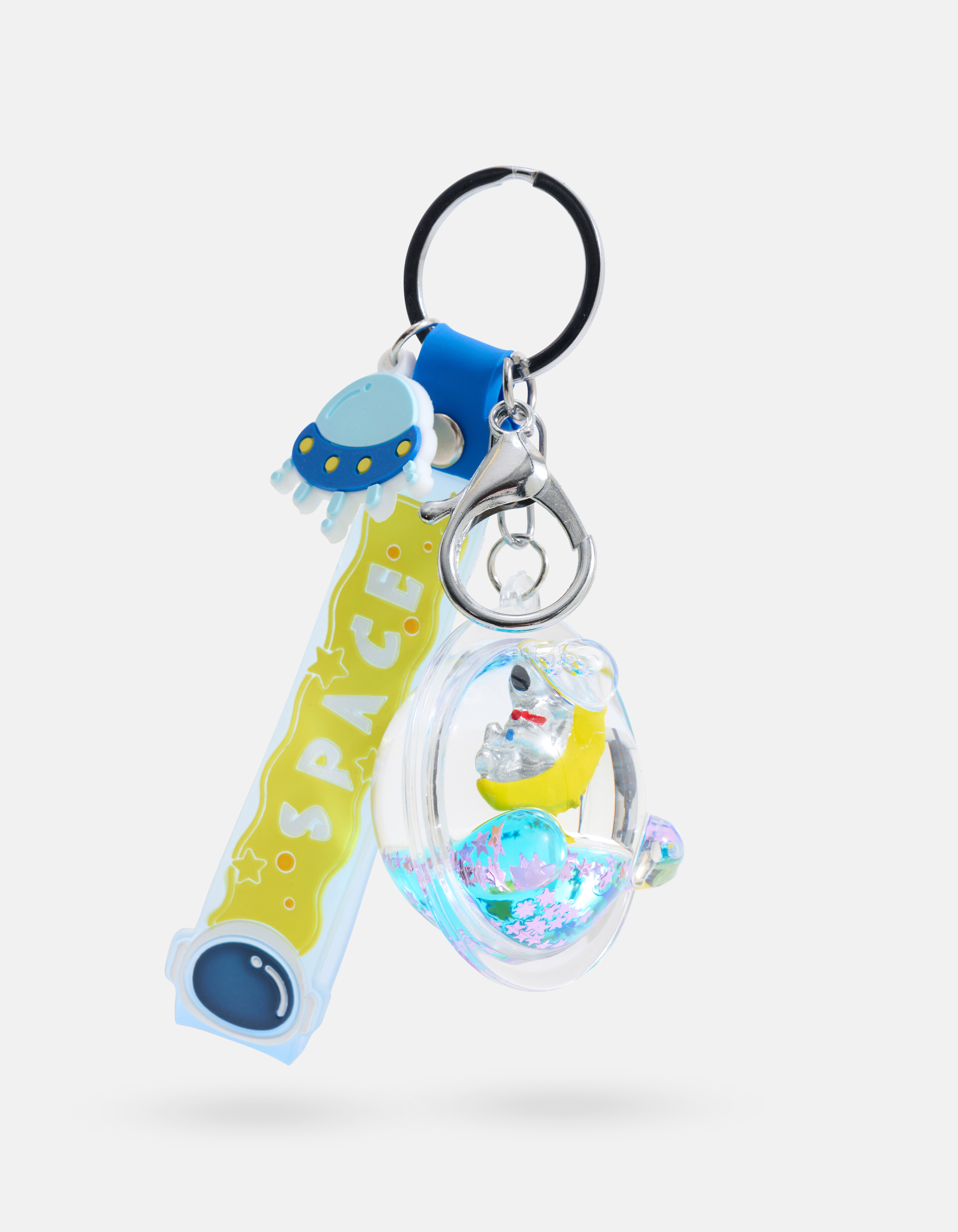 Musthave! Geef je schooltas een extra touch met deze te leuke sleutelhanger. De hanger wordt gekenmerkt door de zilveren ring en een lichtblauw bandje. Daarnaast hangt er een bedel aan. Hierin zit een blauwe vloeistof met kleine glittertjes en een astronaut poppetje op de maan. De perfecte accessoire om je schooltas op te pimpen!