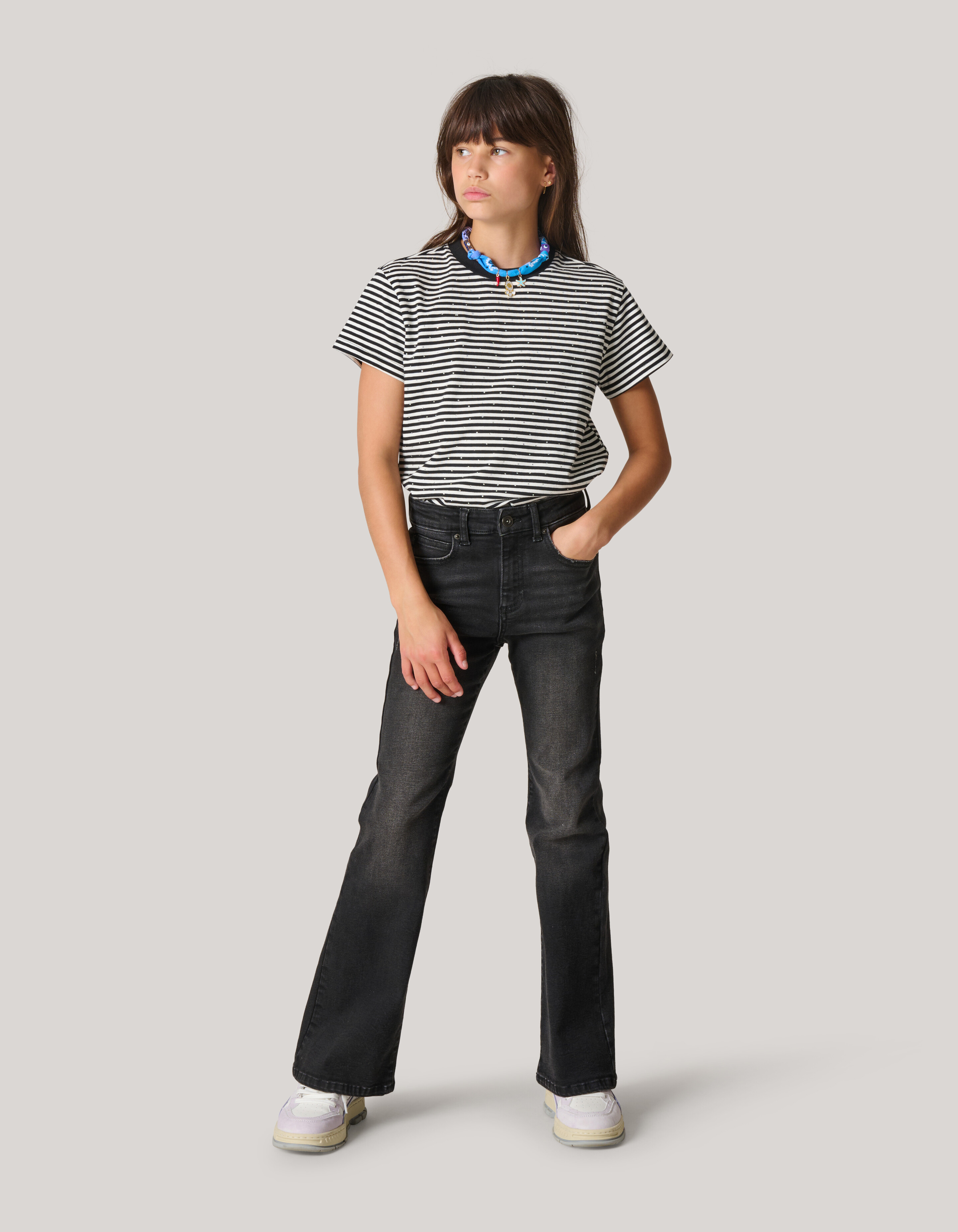 Rock your denim, own the world! De Flared Denim heeft een hoge taille, een 5-pocket model, een stretch stof, een verstelbare tailleband, een flared model met uitlopende broekspijpen en een knoop-en ritssluiting. Het item wordt gekenmerkt door de zwarte kleur met een subtiele wassing op de voorzijde. Verder heeft de jeans nog destroyed details, waardoor je een rocky effect krijgt. De jeans is gemaakt van katoen, polyester, viscose en elastaan. Door deze samenstelling is het sterk van kwaliteit, vormvast, kleurvast, comfortabel en subtiel rekbaar. Maak je look compleet met een statement t-shirt en je bent ready to go!