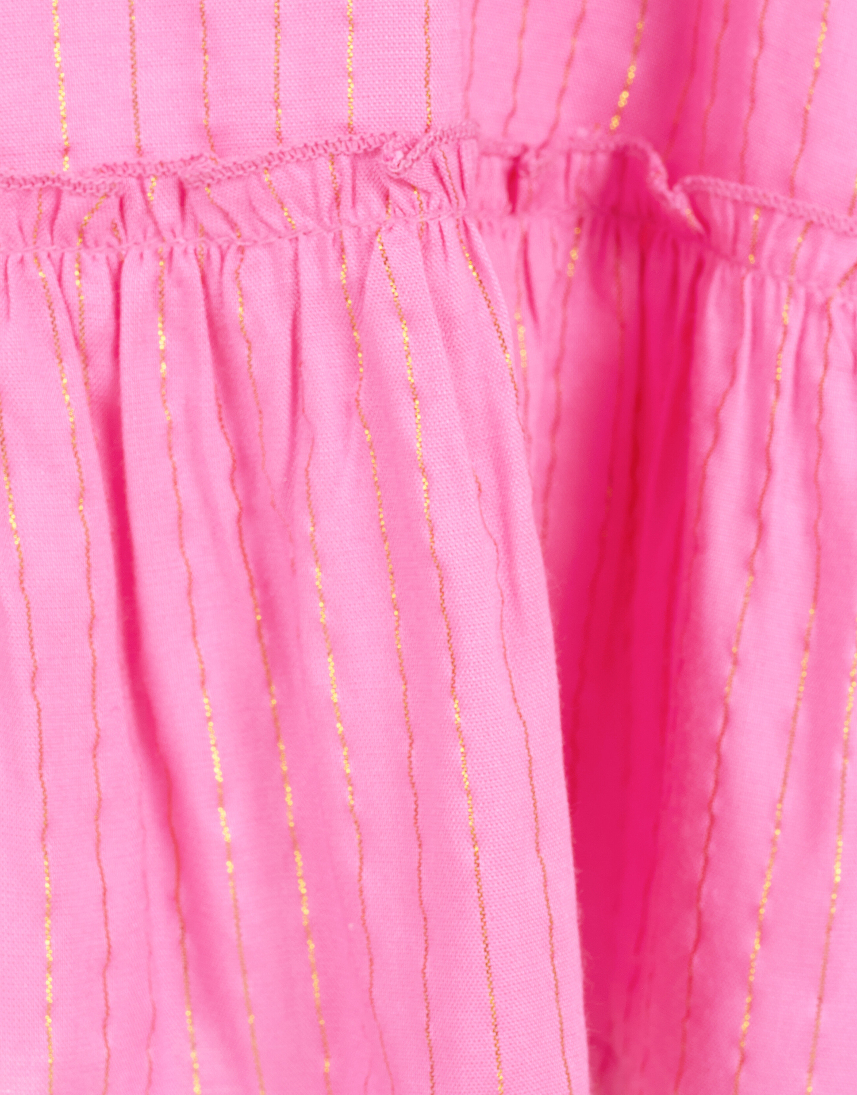 Think pink! De Lurex Jurk heeft een uitlopend model, een korte lengte en is mouwloos. Het item wordt gekenmerkt door de roze kleur met een all-over gouden lurexdraad door de stof heen geweven. Verder heeft de jurk nog een self fabric ceintuur, zodat de taille extra geaccentueerd wordt. Combineer het samen met een chunky sneaker en een pet voor een stoere look!