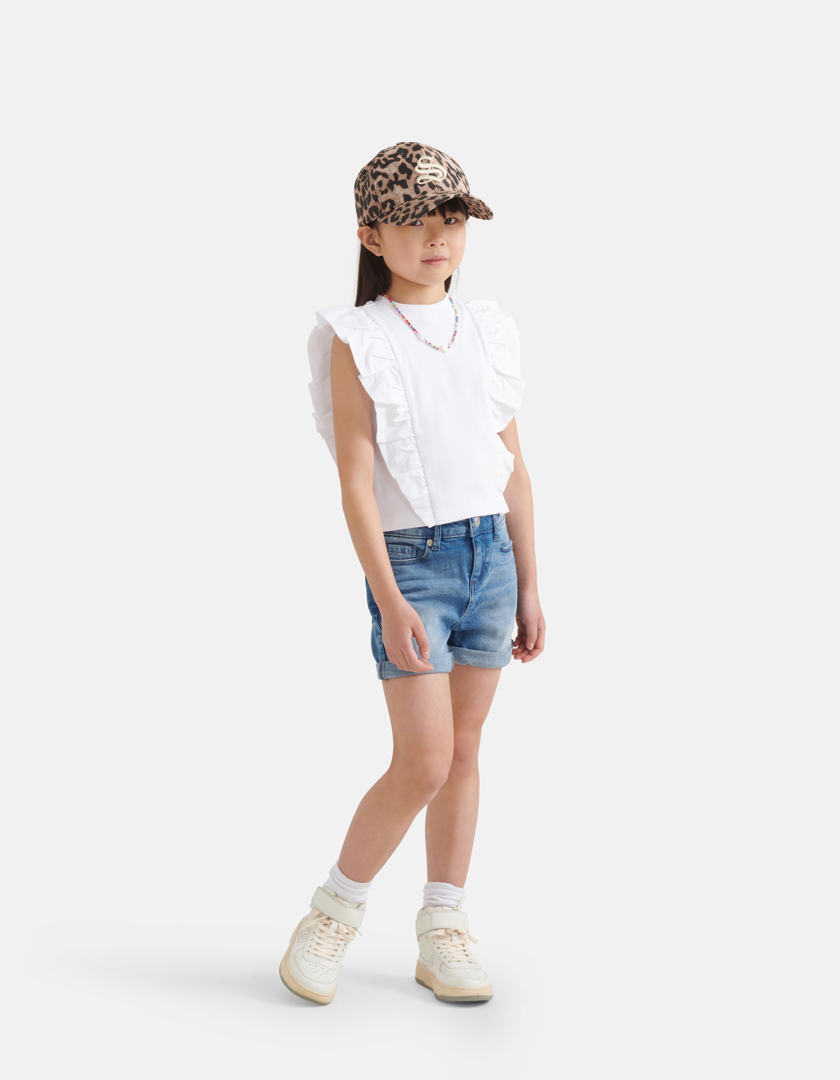 Een denim short is de perfecte toevoeging aan jouw garderobe! Het shortje heeft een hoge taille, een 5-pocket model, een korte broekspijp en een knoop-en ritssluiting. Het item wordt gekenmerkt door de mediumstone blauwe kleur en de omgeslagen broekspijpen. Een fijn detail is de elastieke band aan de binnenzijde van het shortje. Zo kan je de taille op verschillende maten verstellen. Het is gemaakt van viscose, polyester, elastaan en katoen. Door deze samenstelling is het vormvast, kleurvast, sterk van kwaliteit, rekt het subtiel mee en draagt het comfortabel. Maak de look compleet met een witte top, een paar sneakers en edgy accessoires voor een stijlvolle look!