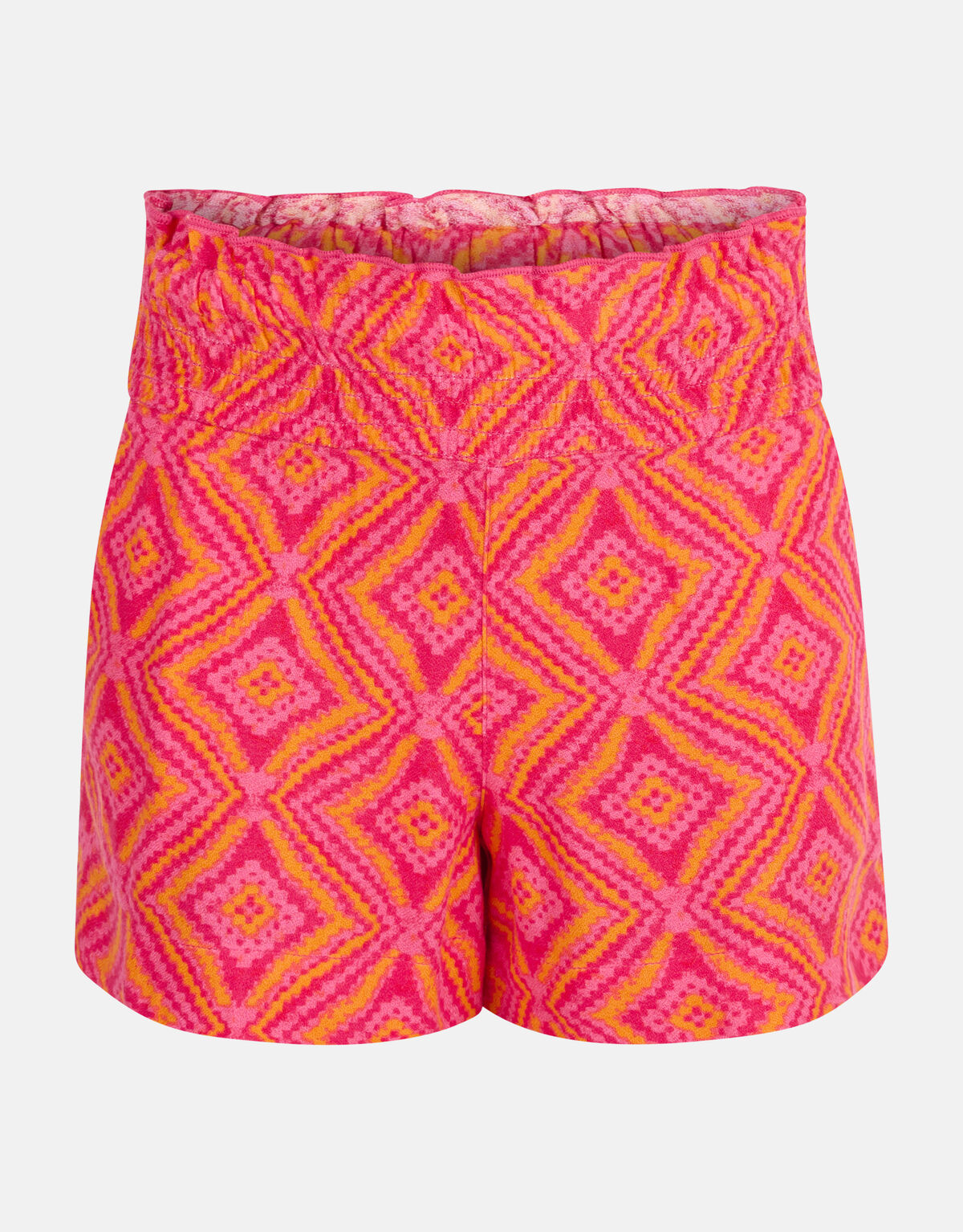 Trending! De Ikat Print Short heeft een hoge taille, een wijd uitlopend model, een elastieke band in de taille en steekzakken. Het item wordt gekenmerkt door de roze kleur met een all-over ikat print in de kleur oranje. Verder heeft het een smock detail in de taille met een subtiele ruffle. Het is gemaakt van 100% viscose, hierdoor is het kleurvast en draagt het comfortabel. Maak de look compleet met een t-shirt of de bijpassende blouse voor een stijlvolle look!