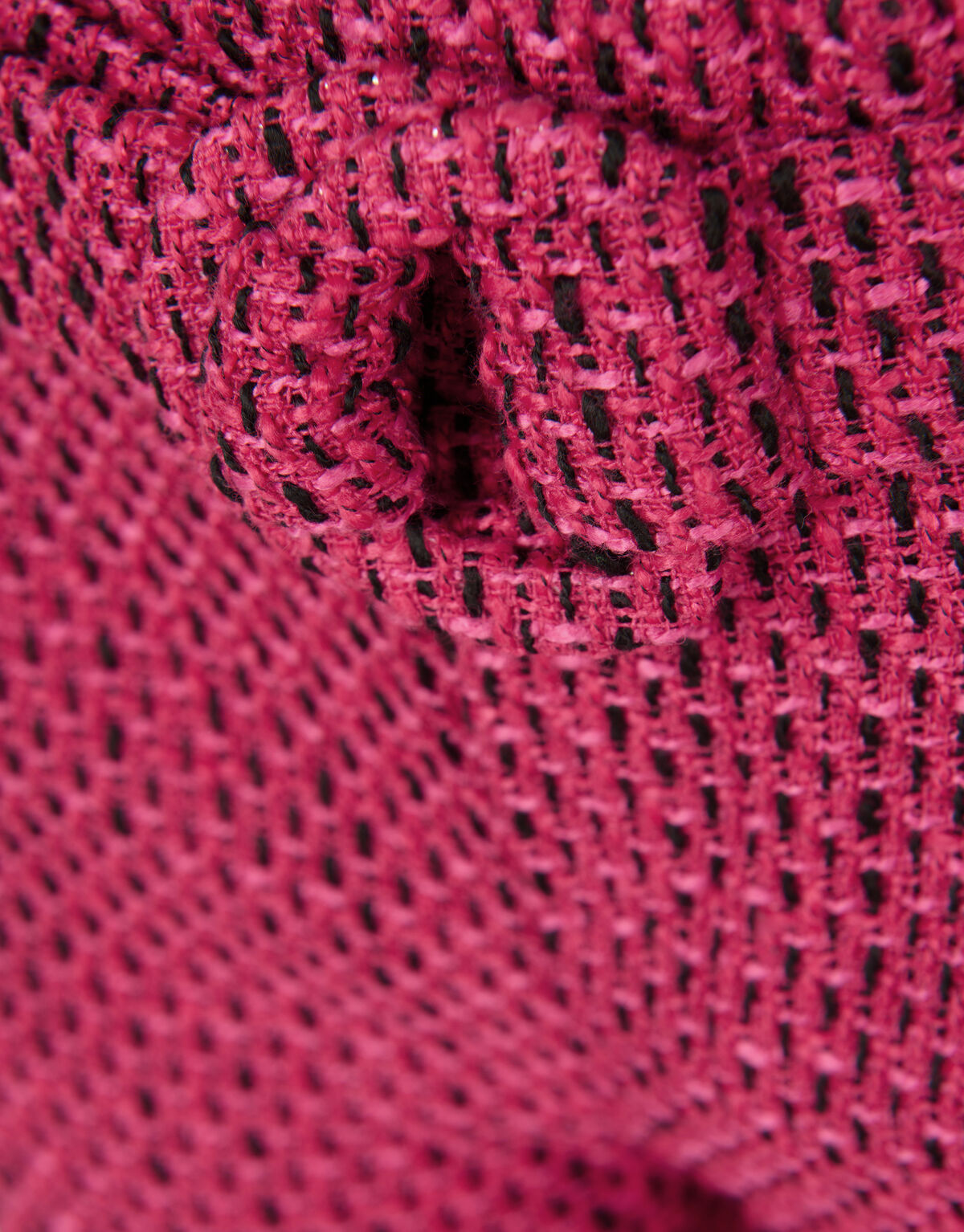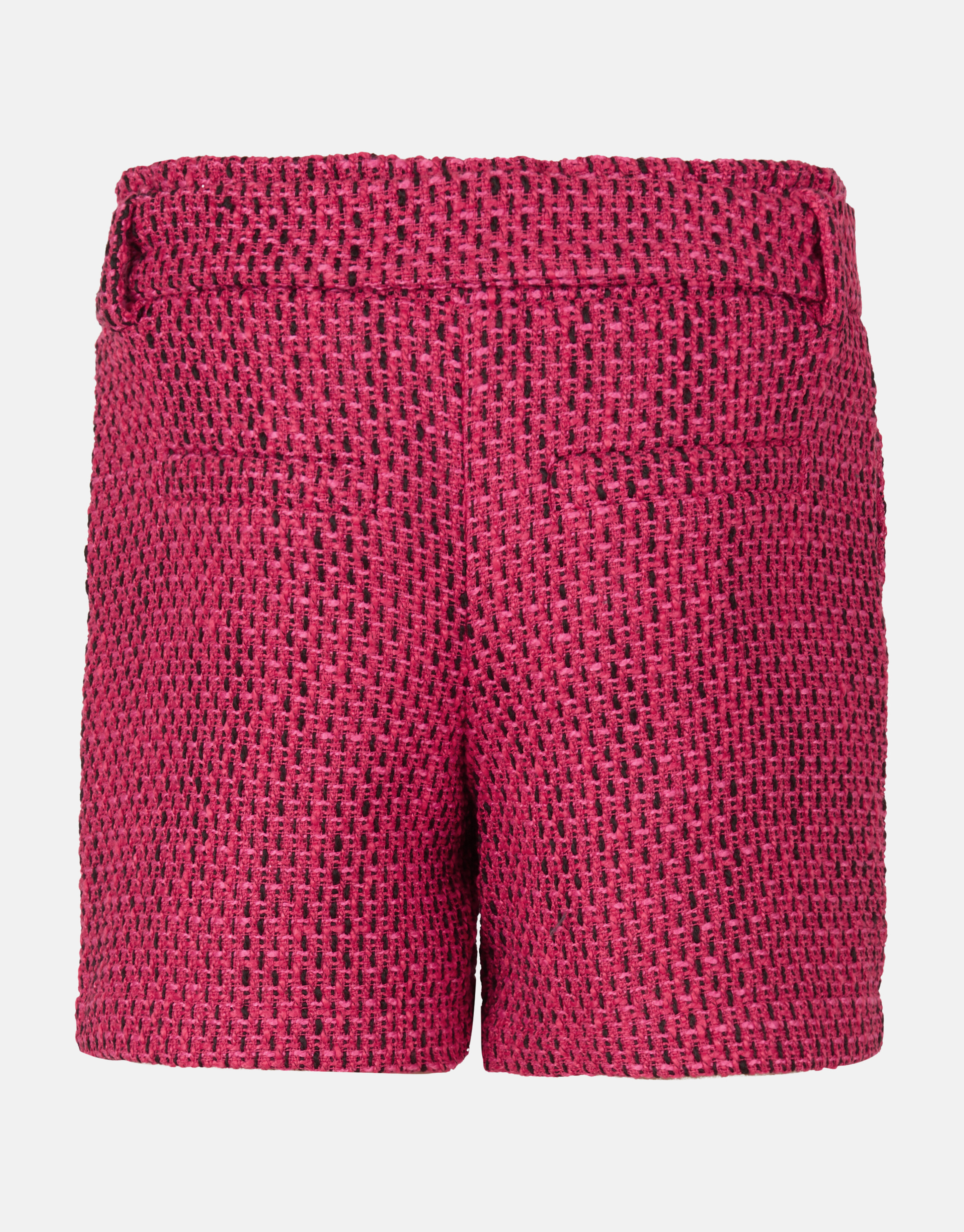 Love at first sight! De Tweed Short heeft een korte broekspijp, een hoge taille, steekzakken en een elastieke band met een bijpassende riem. Het item wordt gekenmerkt door de luxueuze tweed stof, de roze kleur met zwarte details. Combineer het samen met een statement t-shirt en het bijpassende jasje voor een complete look!