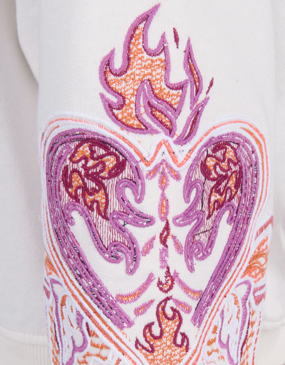 Comfy & stylish! De Embroidery Sweater heeft lange mouwen, een hoge ronde hals en een relaxed fit. Het item wordt gekenmerkt door de gebroken witte kleur met borduursels op de mouwen. De borduursels hebben de kleur oranje en paars in de vorm van een hart en vlammen. Het is gemaakt van katoen en polyester, hierdoor is het sterk van kwaliteit, vormvast en comfortabel. Maak de look compleet met een leopard legging en een gilet!