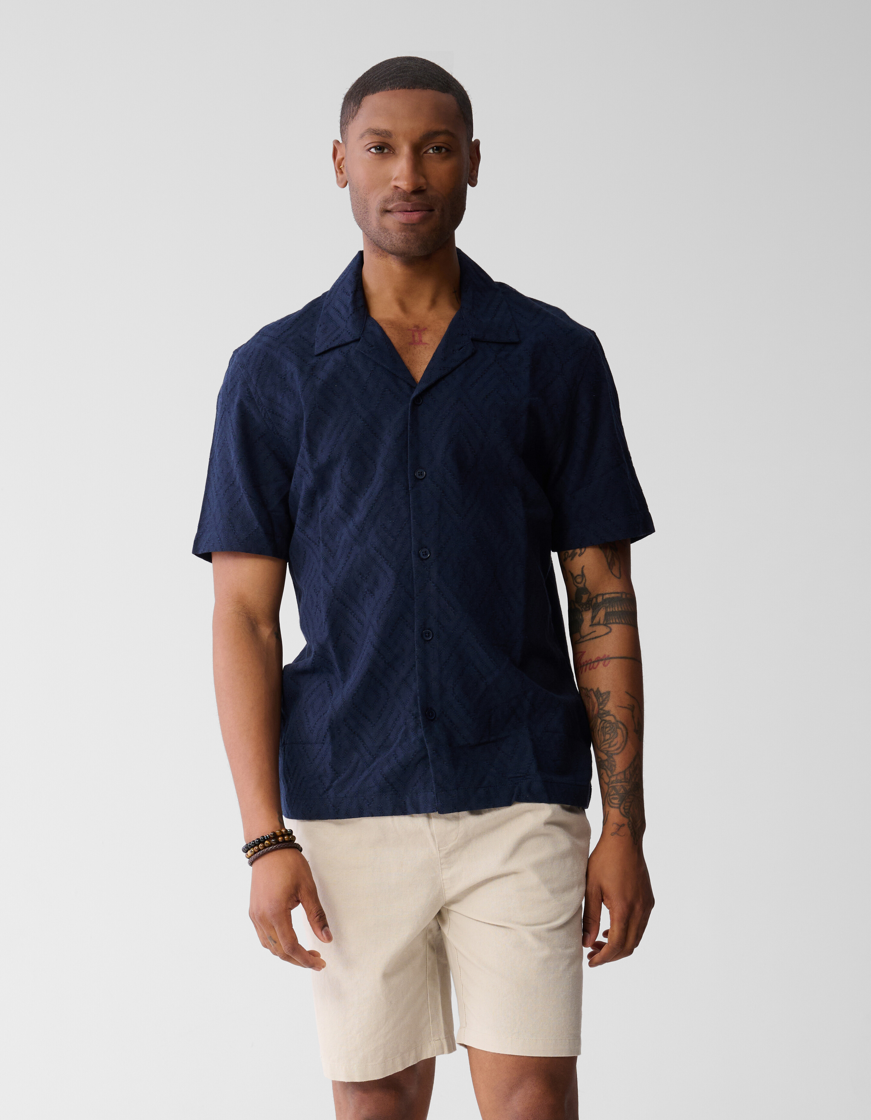 Ontdek dit Wavy Jacqaurd Shirt Donkerblauw! Dit shirt heeft korte mouwen, een button down kraag, een non-stretch stof en een regular fit. Verder wordt het item gekenmerkt door de donkerblauwe kleur en het wavy patroon. Het shirt is gemaakt van katoen en viscose. Deze samenstelling zorgt ervoor dat het shirt comfortabel draagt en kleurvast is. Het model heeft een lengte van 185 cm en draagt een maat L. Het shirt heeft een totale lengte van 70,5 cm bij een maar L. Combineer het shirt met een leuke short voor de perfecte zomer look!