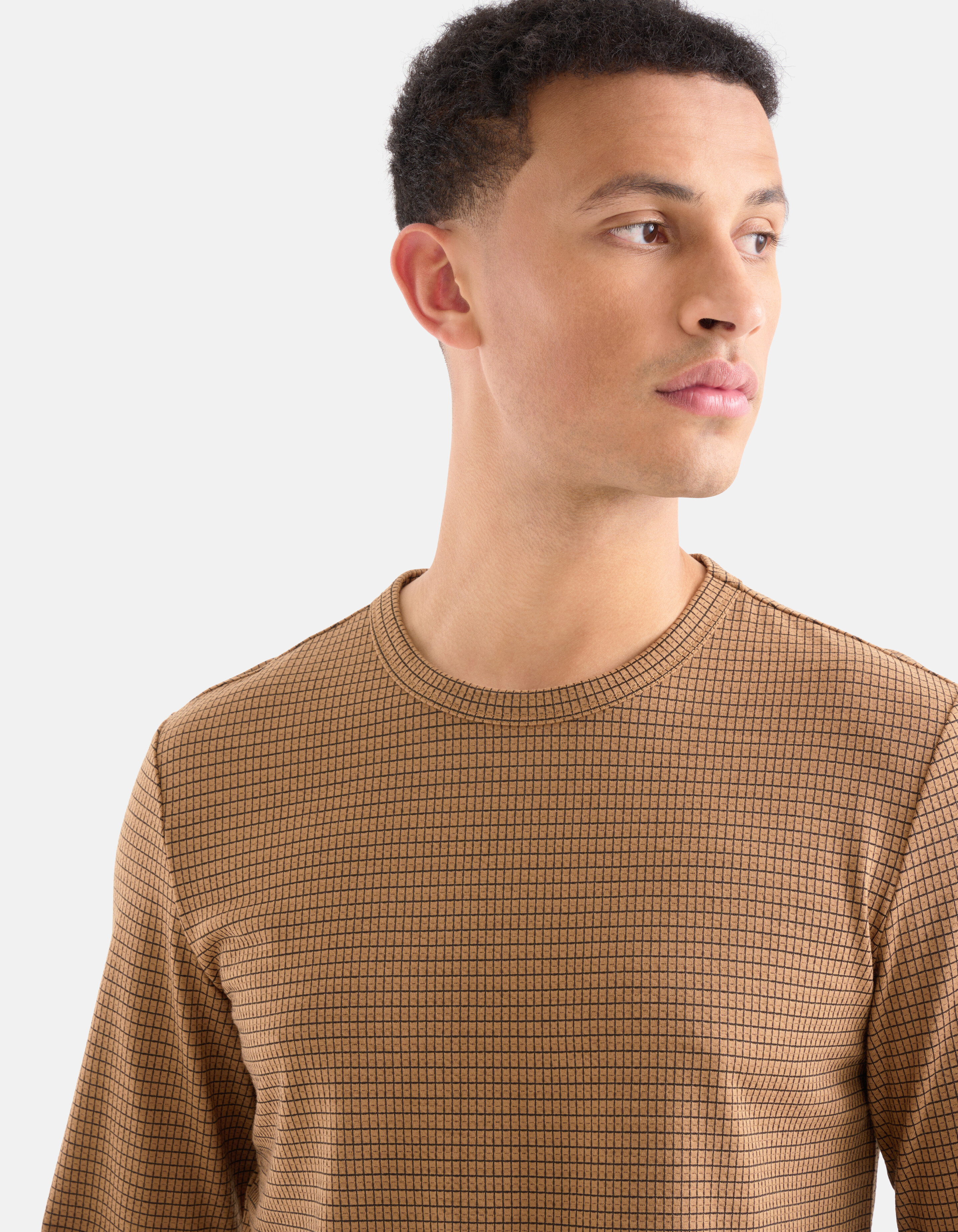 Trend alert! Het Contrast T-shirt heeft lange mouwen, een ronde hals en een regular fit. Het item wordt gekenmerkt door een bruine kleur met een subtiele all-over fine line design in de kleur zwart. Het is gemaakt van viscose, polyester en elastaan, waardoor het fijn draagt, vormvast is en meerekt. Combineer het item samen met een stoere broek en sneakers voor een casual look! Het model heeft een lengte van 188 cm en draagt maat M. Het artikel heeft een totale lengte van 71 cm bij maat M.