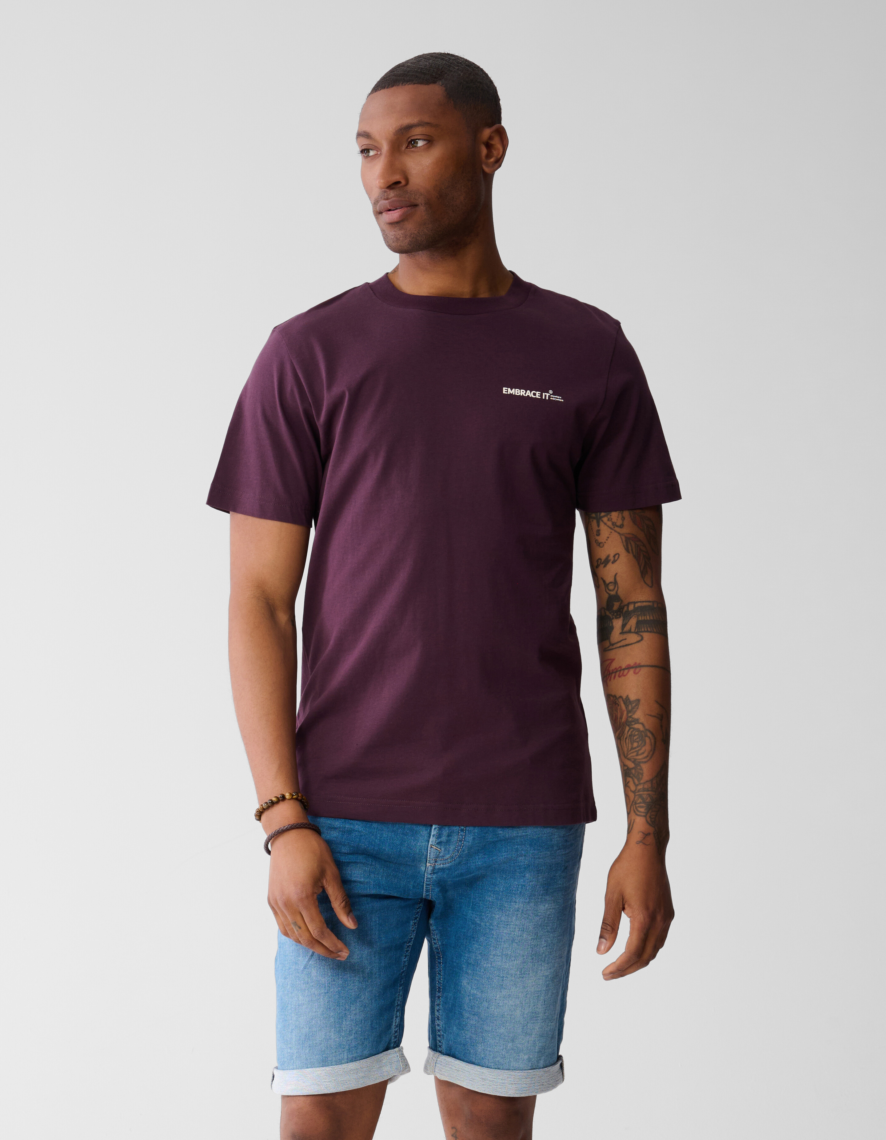 Ontdek het perfecte T-shirt voor elke gelegenheid in een prachtige donkerrode kleur. Het Embrace Artwork T-shirt Donkerrood heeft korte mouwen, een ronde hals, low-stretch stof en een regular fit. Het subtiele embrace it artwork maakt het gemakkelijk te combineren met elke outfit. Het t-shirt is gemaakt van 100% katoen waardoor deze comfortabel zit. Het model heeft een lengte van 185 cm en draagt maat L. Het item heeft een totale lengte van 70.5 cm bij maat L. Ideaal voor een casual dag of een relaxte avond uit.