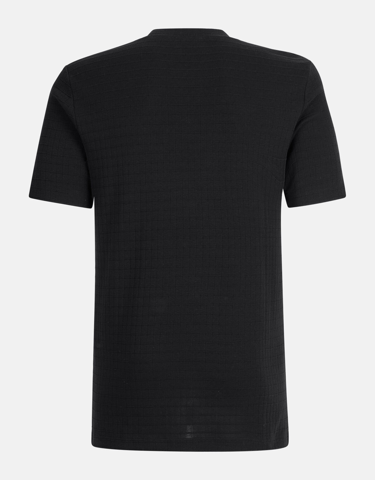 Black is always a good idea! Het Structuur T-shirt heeft een korte mouw, een hoge ronde hals en een regular fit. Het item wordt gekenmerkt door de zwarte kleur met een all-over structuur in de stof. Het structuur heeft een print van blokjes in de stof verwerkt, waardoor het een uniek effect krijgt. Verder is het t-shirt gemaakt van 100% katoen, hierdoor draagt het comfortabel en is het sterk van kwaliteit. Maak de look compleet met een beige short of een jeans en je bent ready to go! Het model heeft een lengte van 189 cm en draagt maat M. Het artikel heeft een totale lengte van 75 cm bij maat M.