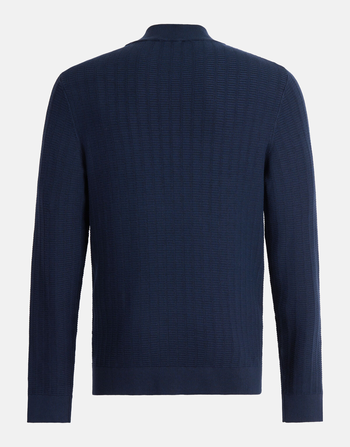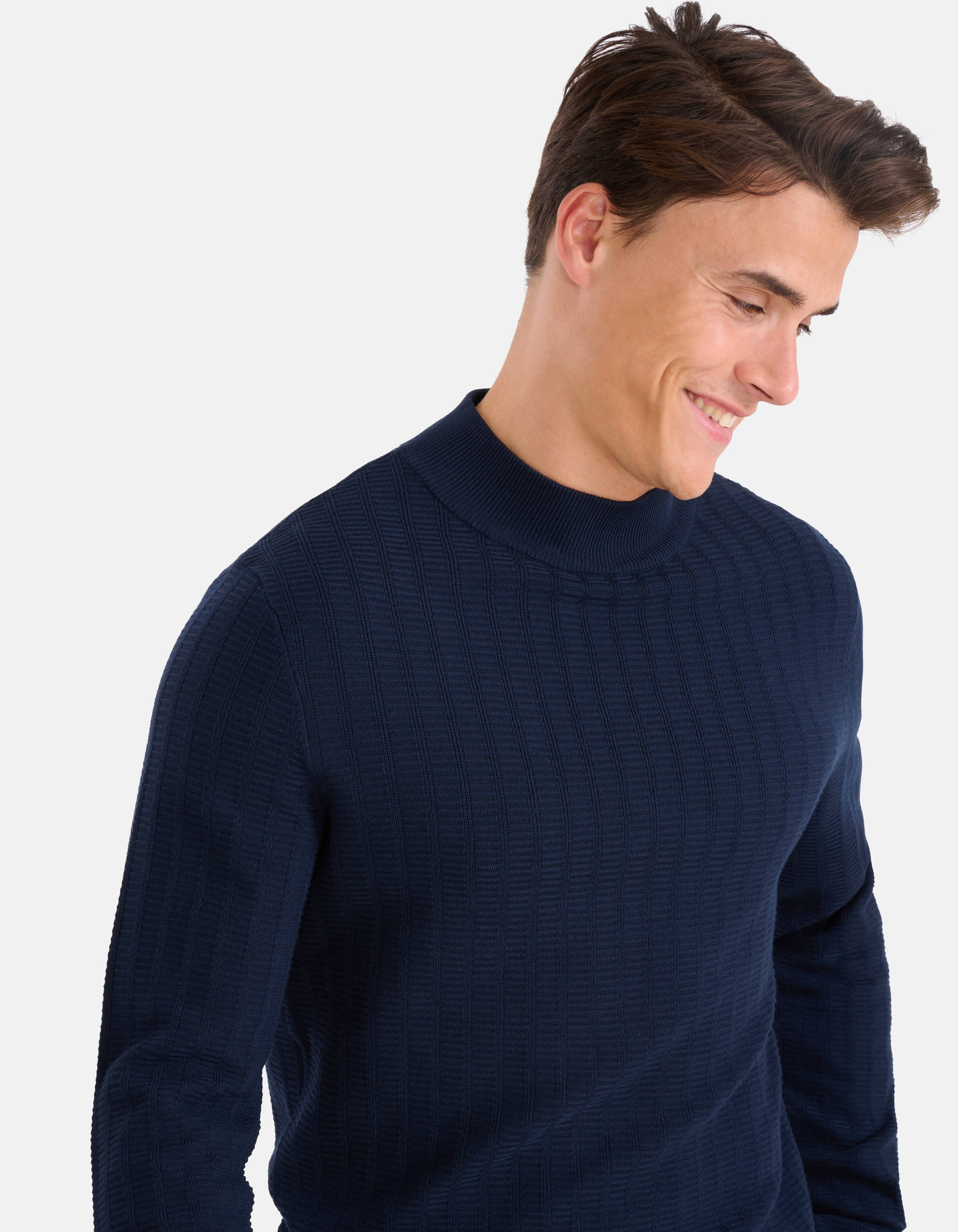 Comfort meets style! De Structuur Trui heeft lange mouwen, een hoge opstaande hals, een stretch stof en een regular fit. Het item wordt gekenmerkt door het fijne breisel, de donkerblauwe kleur met een structuur in de stof verwerkt. Verder is het gemaakt van viscose en polyamide. Door deze samenstelling is het sterk van kwaliteit, vormvast, kleurvast en comfortabel. Draag het samen met een grijze jeans en een paar sneakers voor een stylish look! Het model heeft een lengte van 185 cm en draagt maat M. Het artikel heeft een totale lengte van 73 cm bij maat M.