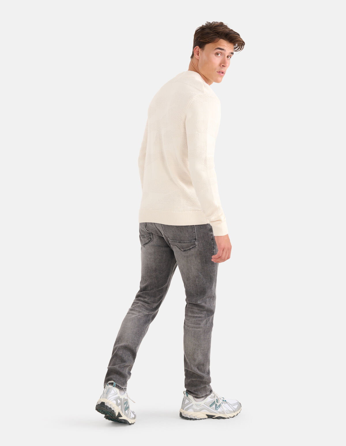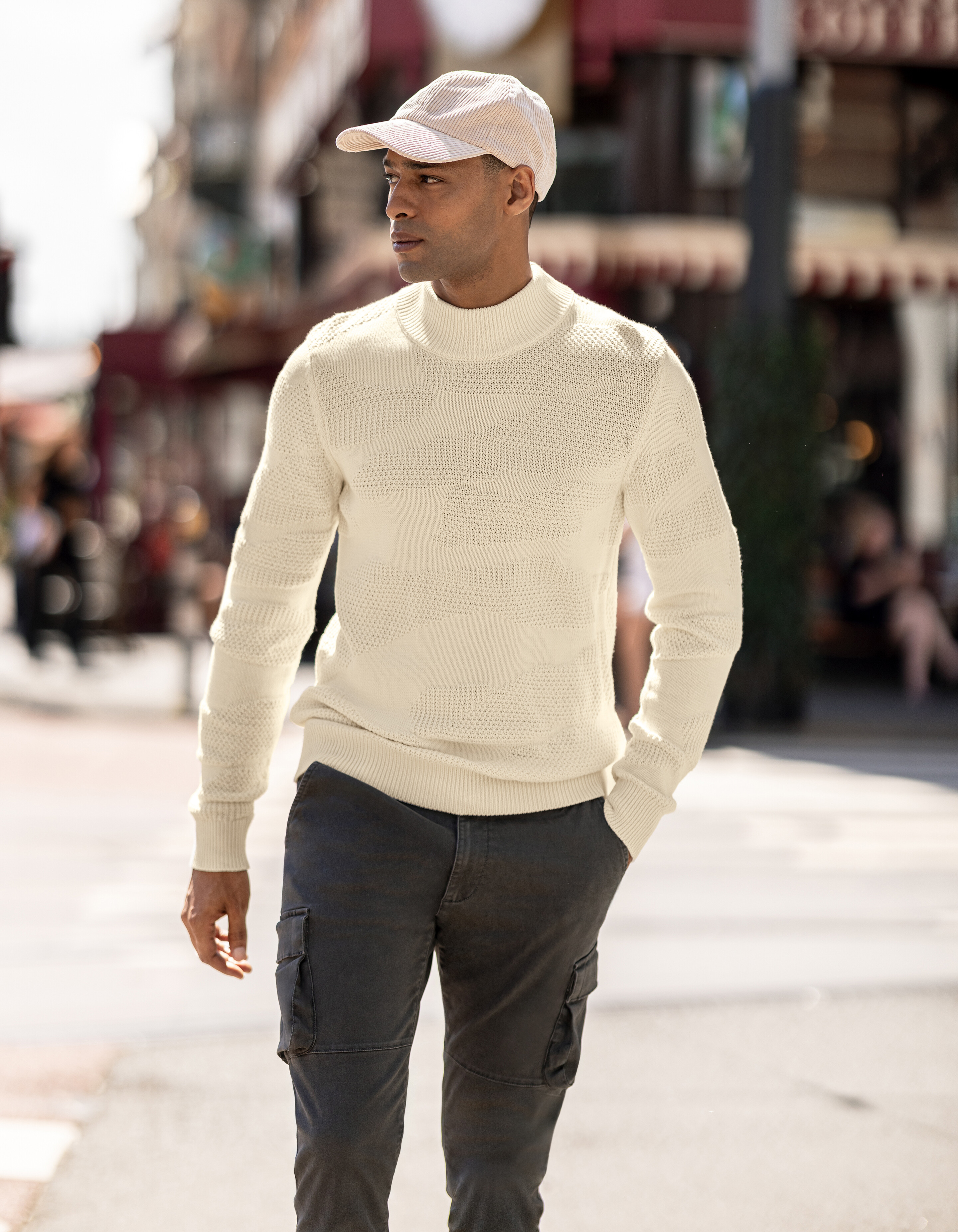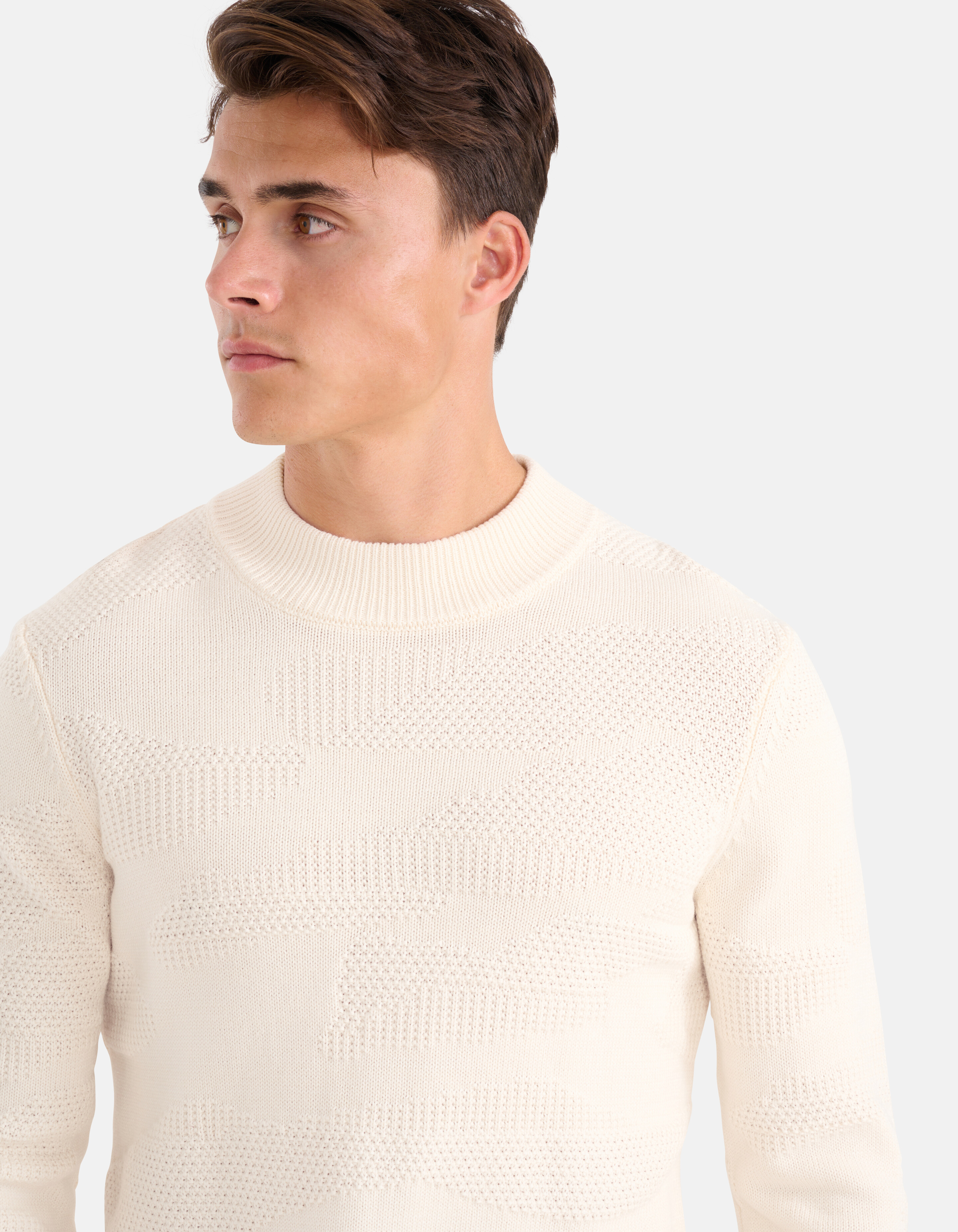 Jouw everyday essential met een urban edge! De Structuur Trui heeft lange mouwen, een hoge opstaande hals, een grof breisel, een stretch stof en een regular stof. Het item wordt gekenmerkt door de gebroken witte kleur met een camouflage patroon in de stof verwerkt. Door dit patroon heeft de trui een grove structuur. Een leuk detail is de bredere kraag voor een luxueuze uitstraling! Het is gemaakt van 100% katoen, hierdoor is het sterk van kwaliteit en draagt het comfortabel. Maak de look compleet met een grijze denim jeans en je bent good to go! Het model heeft een lengte van 185 cm en draagt maat M. Het artikel heeft een totale lengte van 74 cm bij maat M.