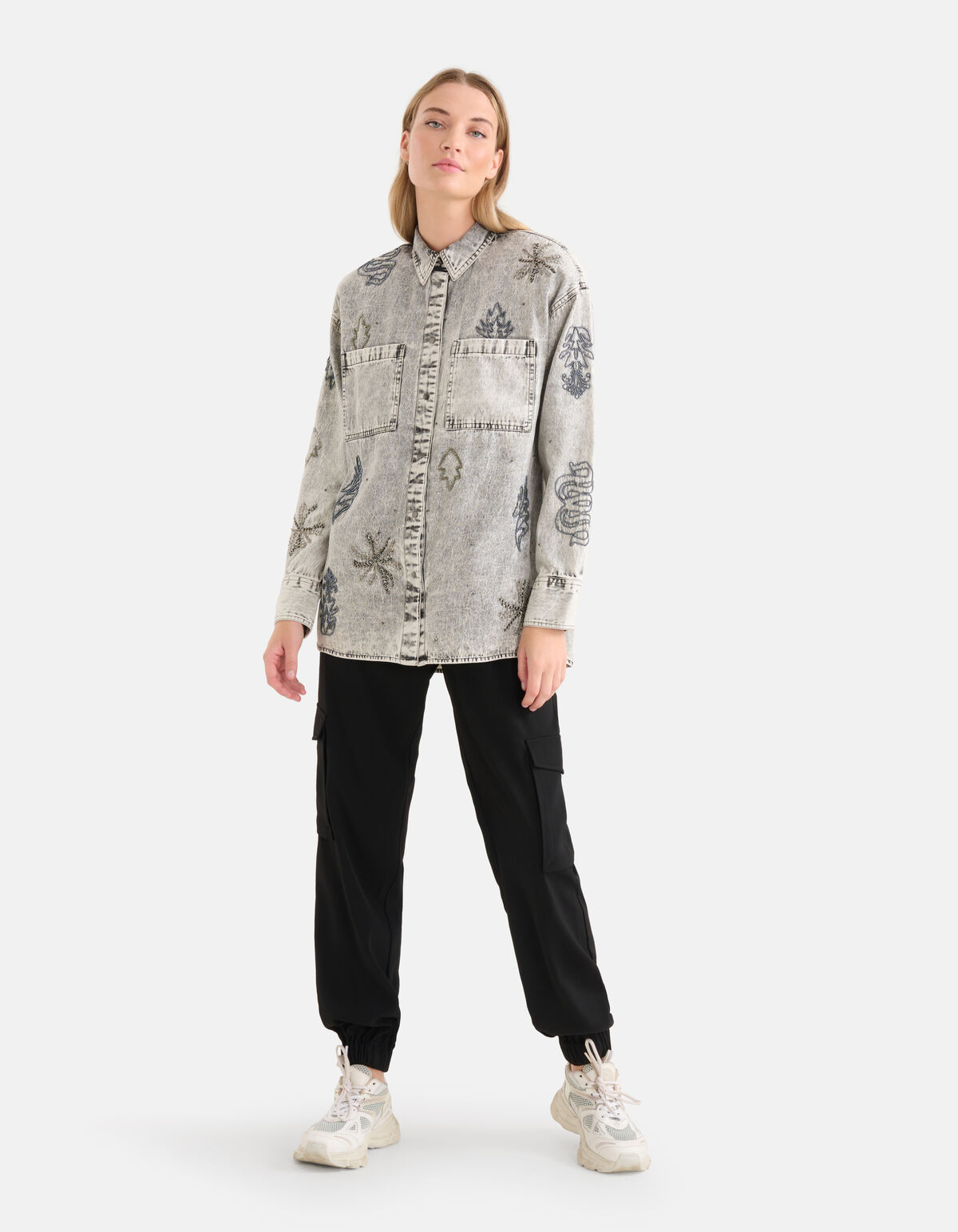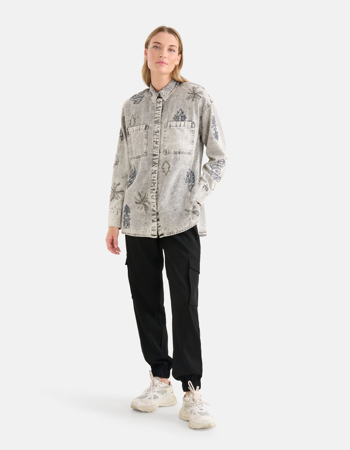 Artistry in every stitch! De Embellished Denim Blouse heeft lange mouwen, een kraag, een non-stretch stof, een drukknoopsluiting, subtiele schoudervullingen en een relaxed fit. Het item wordt gekenmerkt door de grijze kleur met rocky embellished artworks in de kleur zilver en zwart. Door het washed wassing proces is ieder item uniek en kan de kleur dus soms variëren. Verder heeft de blouse een delicate stof door de unieke embellished kralen designs. Het is gemaakt van een katoenen stof, hierdoor is het sterk van kwaliteit en draagt het comfortabel. Maak de look compleet met een cargo broek en een paar sneakers en je bent ready to go! Het model heeft een lengte van 177 cm en draagt maat S/M. Het artikel heeft een totale lengte van 79,5 cm bij maat S/M.