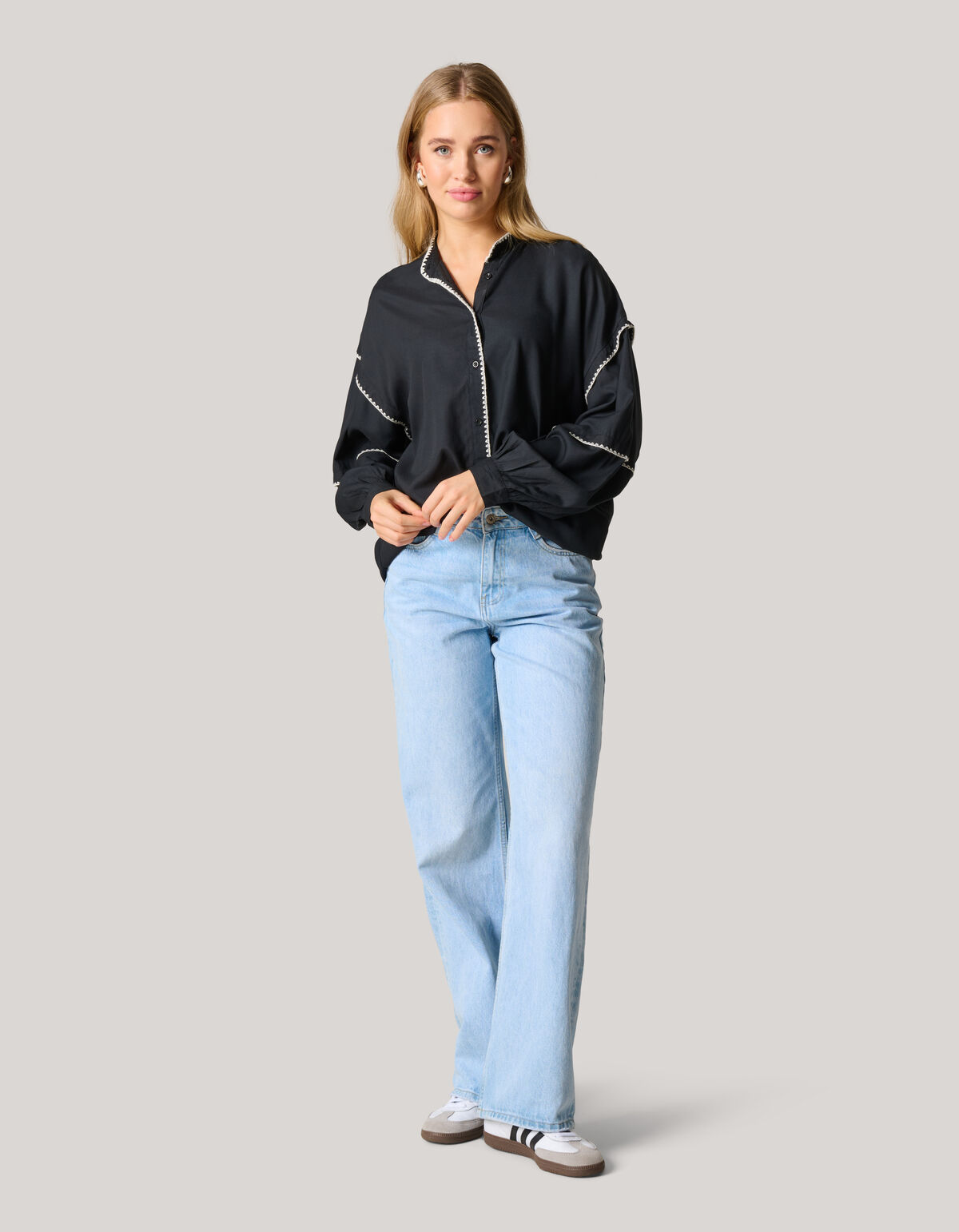 Musthave! De Embroidery Blouse heeft lange mouwen, een hoge hals, een knoopsluiting, een non-stretch stof en een relaxed fit. Het item wordt gekenmerkt door de zwarte kleur met wit geborduurde details. Het item is gemaakt van viscose, hierdoor draagt het comfortabel en is het kleurvast. Het model heeft een lengte van 176 cm en draagt maat S. De totale lengte van deze blouse is 61 cm bij maat S. Combineer het samen met een jeans en een paar hakjes voor een sophisticated look!