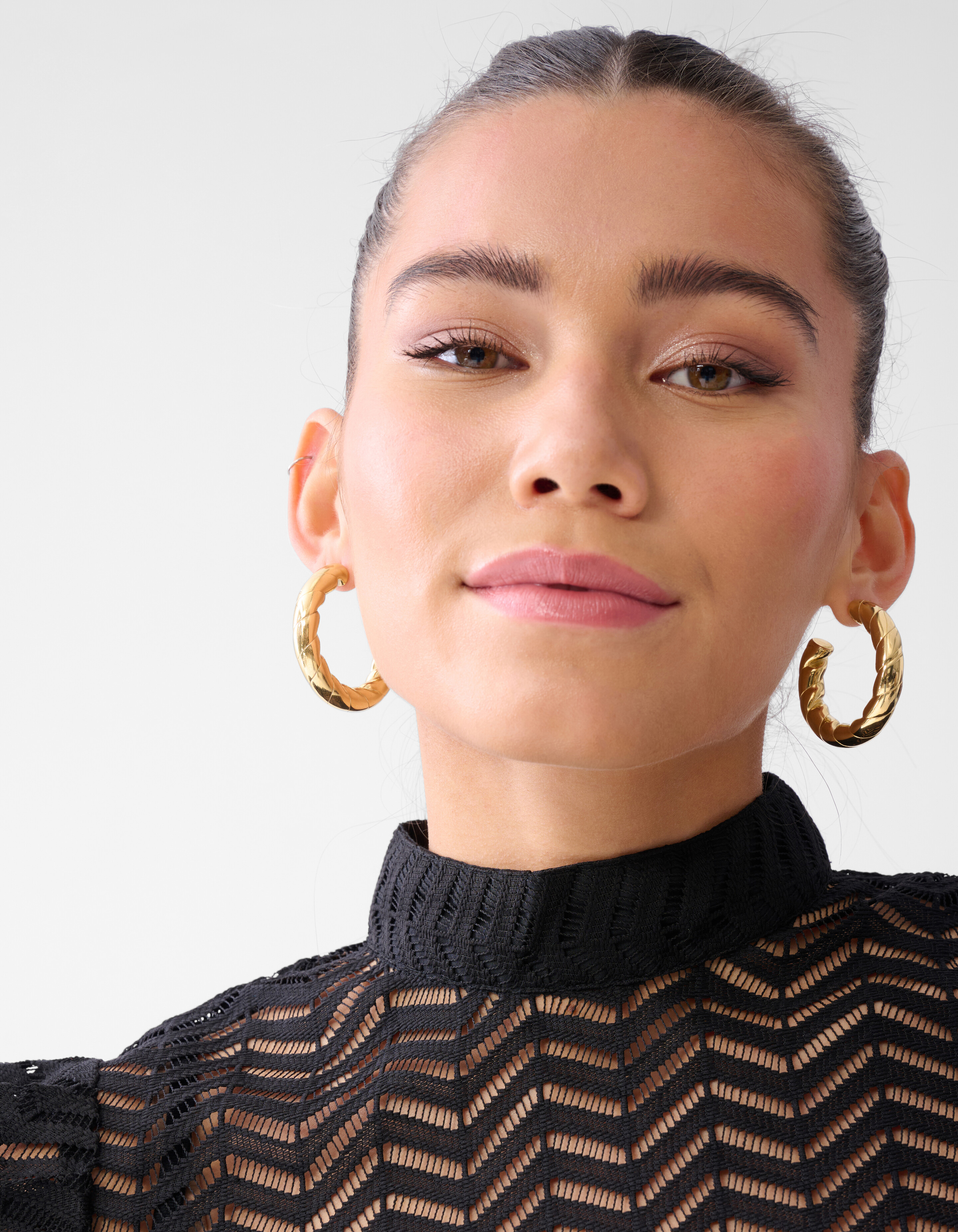 Verhef je stijl met deze elegante zwarte top. De Zigzag Kanten Top Zwart heeft een regular fit, lange mouwen en een hoge kraag met een knoopsluiting. Door het kanten zigzag patroon is de top licht doorschijnend. Het item is gemaakt van 100% polyester waardoor het kleur- en vormvast is en weinig stretch heeft. Het model heeft een lengte van 171 cm en draagt de top in maat S. De top heeft een totale lengte van 59 cm bij een maat S.
