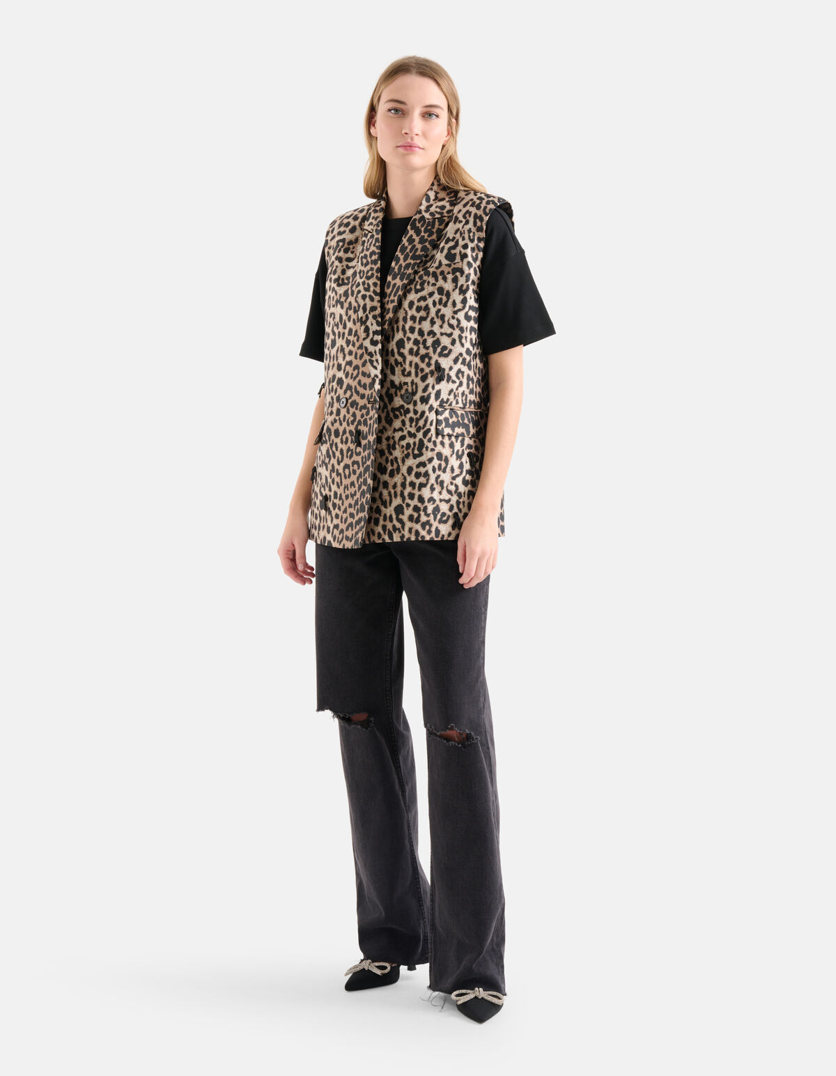 Leopard is my favorite color! Het Leopard Jacquard Gilet heeft een reverse kraag, een relaxed fit, een knoopsluiting, twee klepzakjes op de voorzijde, schoudervullingen en is mouwloos. Het item wordt gekenmerkt door de jacquard ingeweven print en de bruine kleur. De all-over leopard print geeft een stoere twist aan het gilet. Daarnaast heeft het item nog verschillende zwarte kralen details aan de voorzijde en bruine knopen met een marble effect. Het is gemaakt van polyester en polyamide, hierdoor is het artikel sterk van kwaliteit, vormvast, kleurvast en comfortabel. Draag het samen met een oversized t-shirt, een wide leg jeans en strass strik hakken voor een complete look! Het model heeft een lengte van 177 cm en draagt maat XS/S. Het artikel heeft een totale lengte van 75 cm bij maat XS/S.