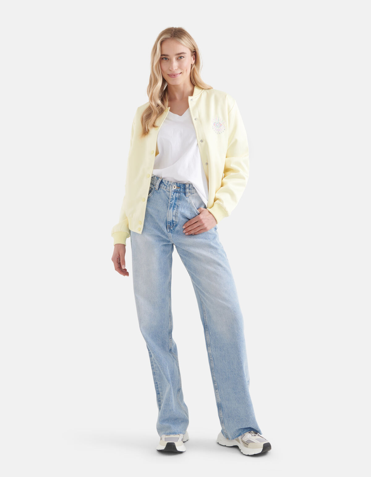 Het Bomber Jack heeft lange mouwen, een drukknoopsluiting, steekzakken en een oversized fit door de combi maten. Het item wordt gekenmerkt door de lichtgele kleur met een glanzende satijnen stof. Verder heeft het jack een retro inspired artwork op de achterkant, waarmee je de show steelt. Het artwork heeft fel paarse en oranje details in het oog en de bliksemschichten geven het jack een funky twist. Door de kleurensamenstelling is de bomber stoer en girly te stylen. Deze exclusieve bomber is een echte musthave voor het voorjaar. Draag het samen met een wide leg jeans, een oversized t-shirt en chunky sneakers en je bent ready to go! Het model heeft een lengte van 177 cm en draagt maat XS/S. Het artikel heeft een totale lengte van 61 cm bij maat XS/S, 63 cm bij maat M/L en 66 cm bij maat L/XL.