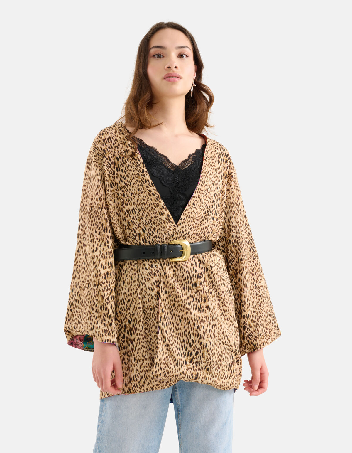 Eyecatcher! De Printed Patch Kimono heeft lange mouwen, geen sluiting en een relaxed fit. Het item wordt gekenmerkt door de all-over printed patches met de bijpassende ceintuur. Een leuk detail is dat de kimono aan twee kanten gedragen kan worden. Als je de wash & care labels er voorzichtig uit knipt heb je aan de andere kant een leopard print kimono. Combineer er dan een zwarte riem bij voor een finishing touch! De kimono is gemaakt van polyester, hierdoor is het vormvast en sterk van kwaliteit. Maak de look compleet met een wide leg jeans, een wit t-shirt en een paar sandalen en je bent ready to go. Het model heeft een lengte van 174 cm en draagt maat S/M. Het artikel heeft een totale lengte van 81,5 cm bij maat S/M.