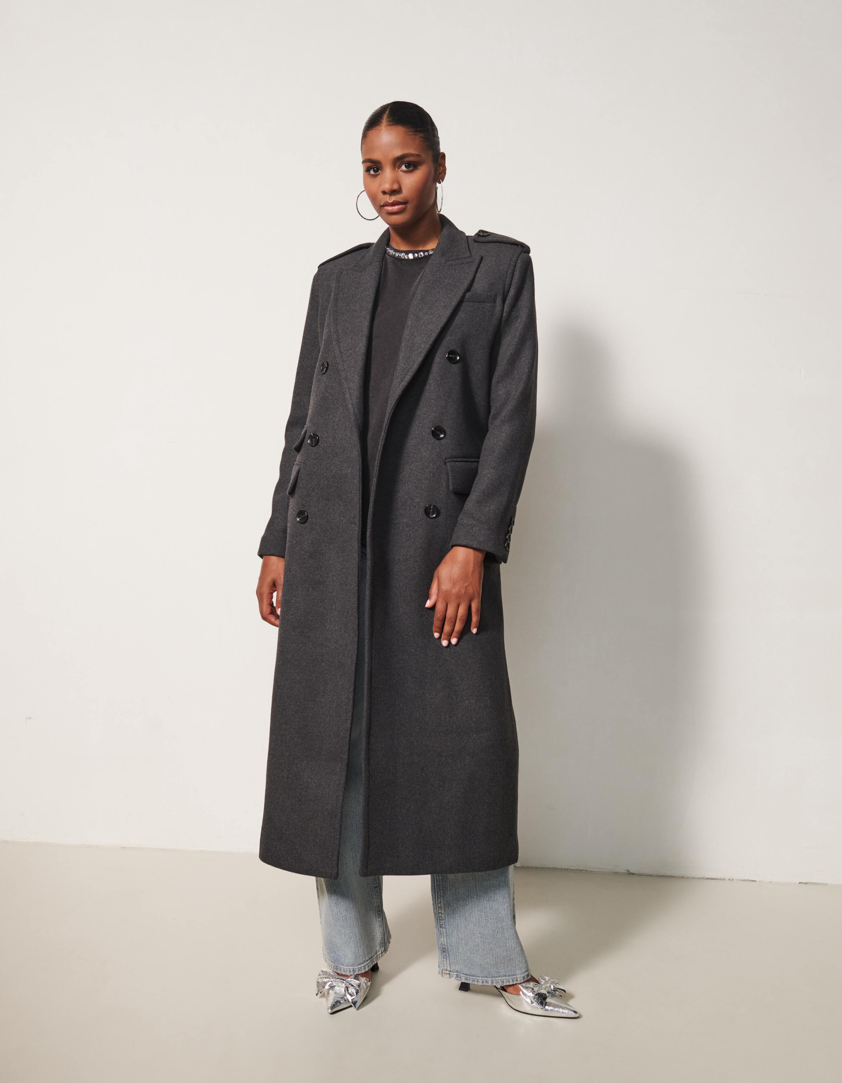 Een echte musthave voor ieders jassencollectie! De Lange Trenchcoat heeft lange mouwen en een rechte fit. De jas heeft een overslag kraag en wordt gesloten middels knopen. Het item wordt gekenmerkt door de wolmix en de donkergrijs gemêleerde kleur. Toffe details aan de jas zijn de insteek zakken aan de voorzijde en de schoudervulling. De jas is gemaakt van polyester en wol, waardoor hij kleur- en vormvast is en warm draagt. Het model is 176 cm lang en draagt een maat XS/S. Het artikel heeft een totale lengte van 128 cm bij een maat XS/S.