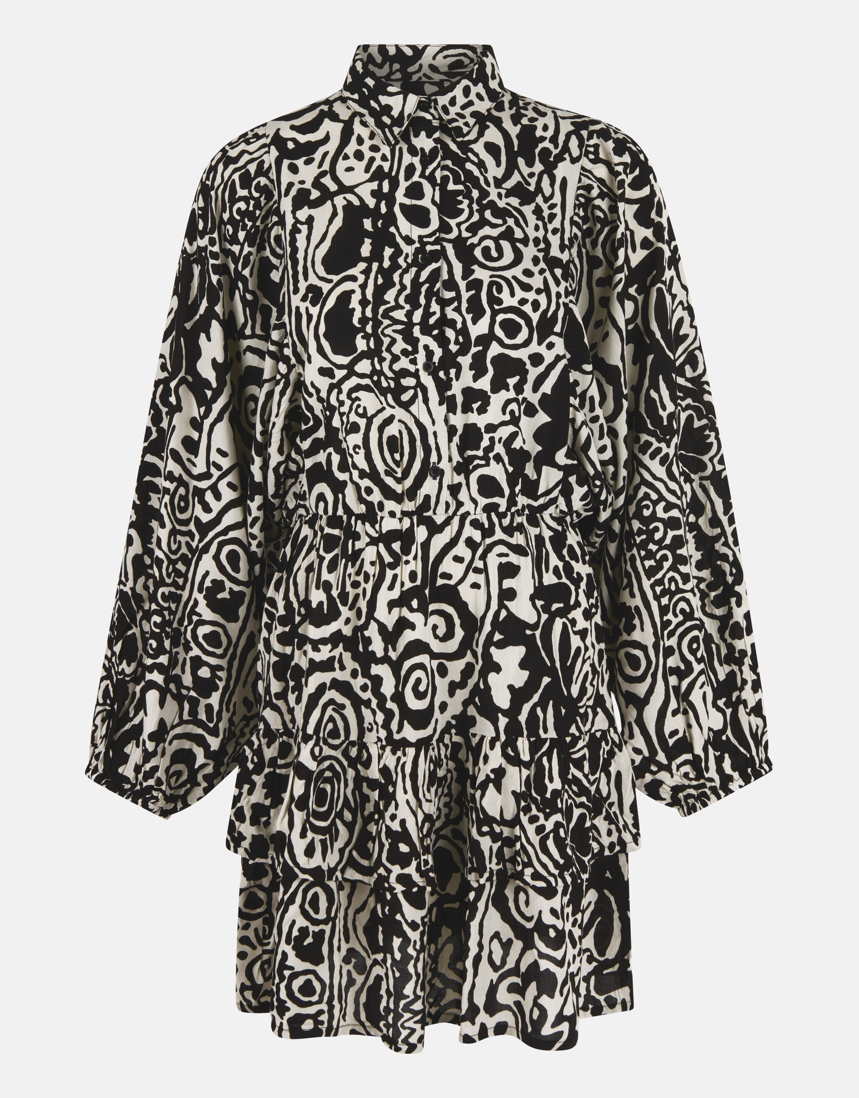 Print it! De Grafische Mini Jurk heeft wijde lange mouwen, een blousekraag, een mini-lengte, een uitlopende fit, een elastieke tailleband en een knoopsluiting tot de taille. Het item wordt gekenmerkt door de witte kleur met een all-over grafische print in een zwarte kleur. De jurk heeft twee lagen ruffles aan de onderzijde en elastiek bij de mouwen. De mouwen zijn oversized to the max, waardoor het een uniek model is. Maak de look compleet met hoge leren laarzen en statement accessoires! Het model heeft een lengte van 177 cm en draagt maat S. Het artikel heeft een totale lengte van 95 cm bij maat S.