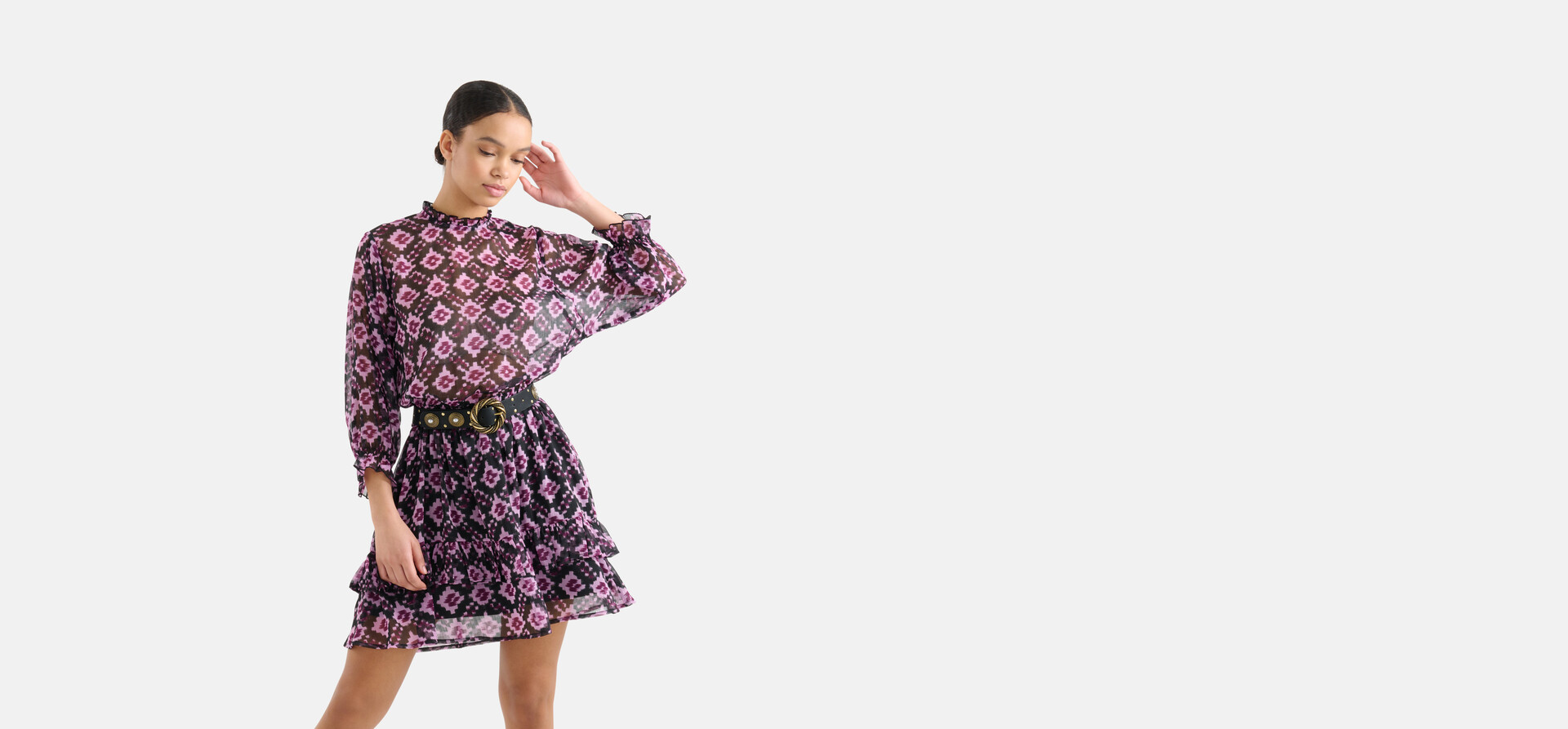 Print it! De Printed Chiffon Jurk heeft een driekwart pofmouwen, een hoge hals, een knoopsluiting op de achterzijde, een mini-lengte en een uitlopende fit. Het item wordt gekenmerkt door de paarse kleur met een grafische all-over print in de kleur zwart en donkerpaars. Verder heeft het een elastieke band in de taille om deze extra te accentueren. Verder heeft de onderzijde twee lagen en een onderrok. Het is gemaakt van polyester hierdoor is het vormvast, sterk van kwaliteit en draagt het comfortabel. Maak de look compleet met een paar leren laarzen en een statement riem en je bent ready to go! Het model heeft een lengte van 173 cm en draagt maat S. Het artikel heeft een totale lengte van 93,5 cm bij maat S.
