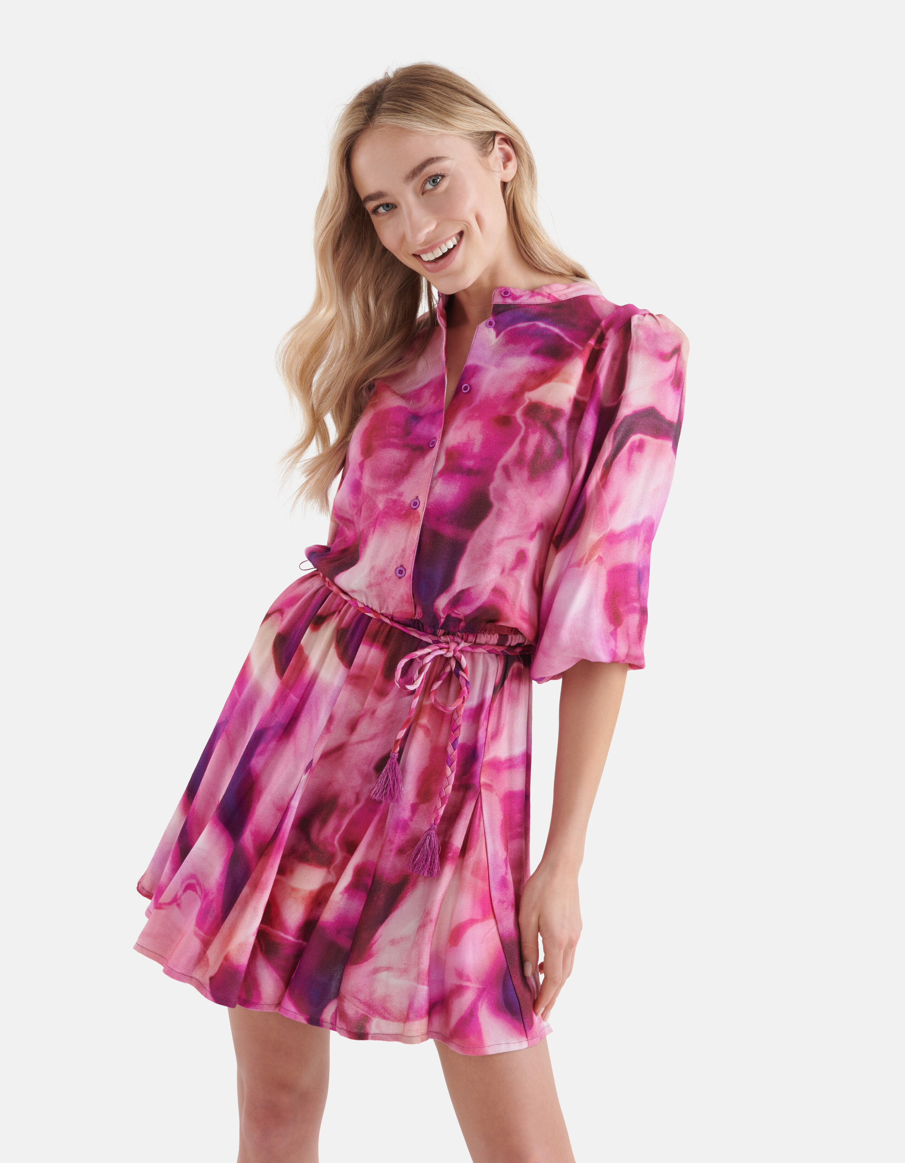 De Tie Dye Jurk heeft lange mouwen, een hoge hals, een knoopsluiting aan de bovenzijde, elastiek in de taille en een uitlopend model. Het item wordt gekenmerkt door de roze kleur met een all-over tie dye print. De print wordt met de hand gemaakt, waardoor elk item uniek is. Een leuk detail is de gevlochten ceintuur met flosjes aan de onderkant. Verder hebben de mouwen een elastiekenband aan de onderzijde, zodat de mouwen extra gaan poffen. Het is gemaakt van 100% viscose, hierdoor is het kleurvast en draagt het comfortabel. Maak de look compleet met een paar vrouwelijke hakken voor een edgy look! Het model heeft een lengte van 177 cm en draagt maat S. Het artikel heeft een totale lengte van 98 cm bij maat S.