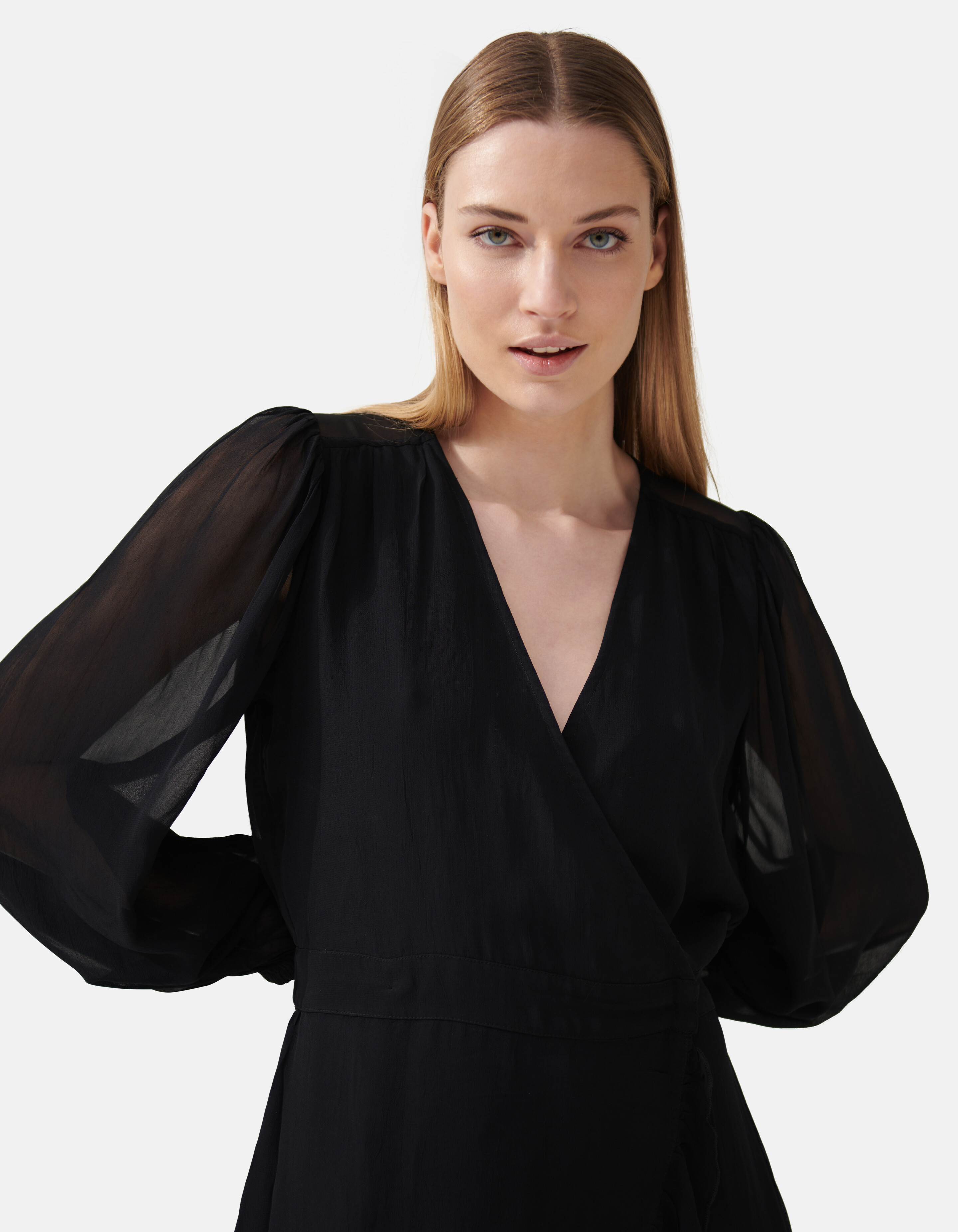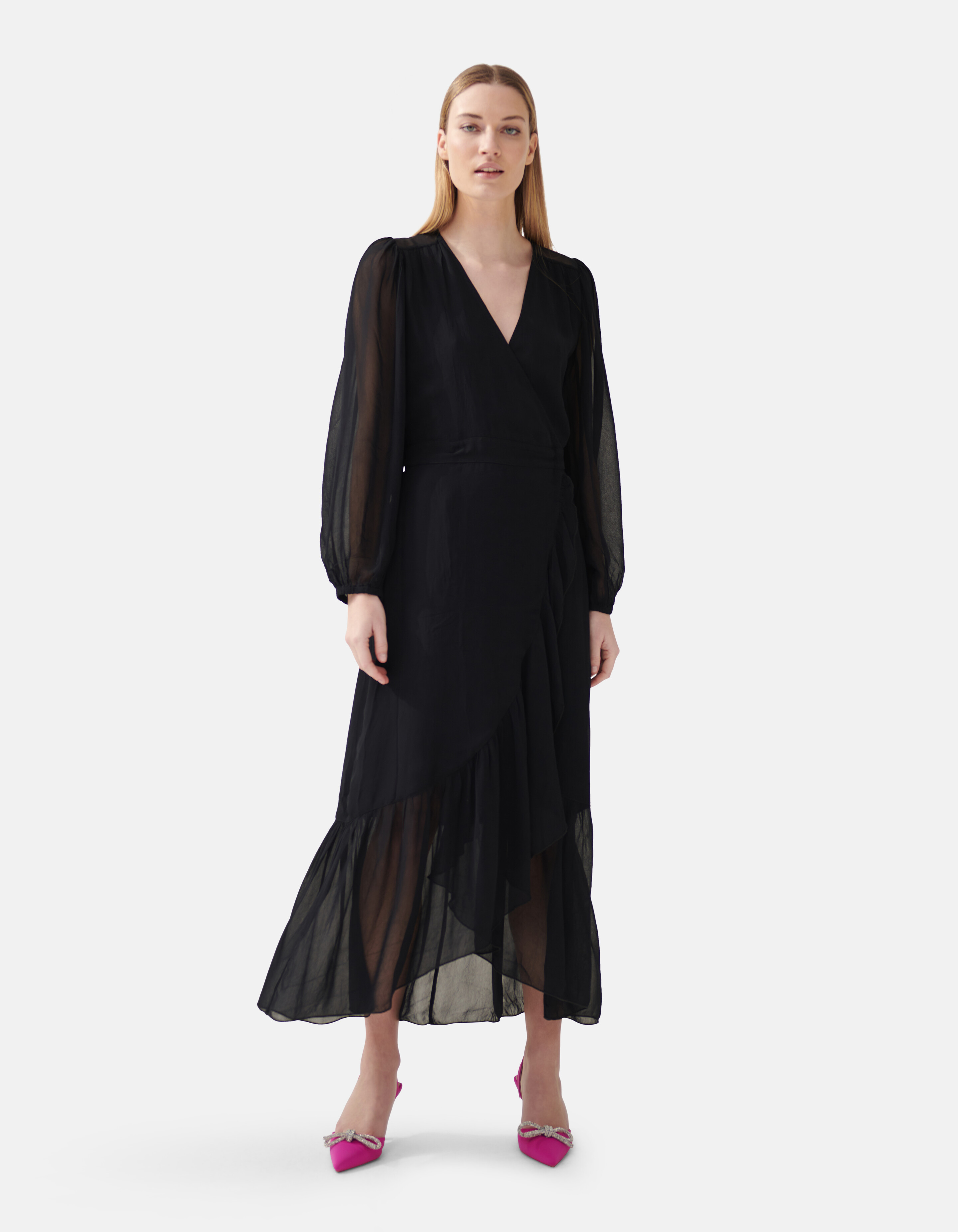 De Wrap Jurk heeft een lange mouw, een v-hals, een knoopsluiting, een wrap model, een maxi-lengte en een uitlopend model. Het item wordt gekenmerkt door de zwarte kleur en de luchtige stof. Een leuk detail zijn de transparante details, een gevoerde binnenkant en de ruffles aan de onderzijde, hierdoor krijgt de jurk een speels effect. Verder hebben de mouwen een elastieke band aan de onderzijde, waardoor de mouwen subtiel gaan poffen. Met de wrap jurk kan je moeiteloos een outfit stylen voor kantoor, een feestje, een date of een gezellige lunch. De jurk kan je ook open dragen als een trendy kaftan. Combineer het samen met een paar hakken of ga voor een festival look met een denim short en een basic top. Het model heeft een lengte van 177 cm en draagt maat S. Het artikel heeft een totale lengte van 132 cm bij maat S.