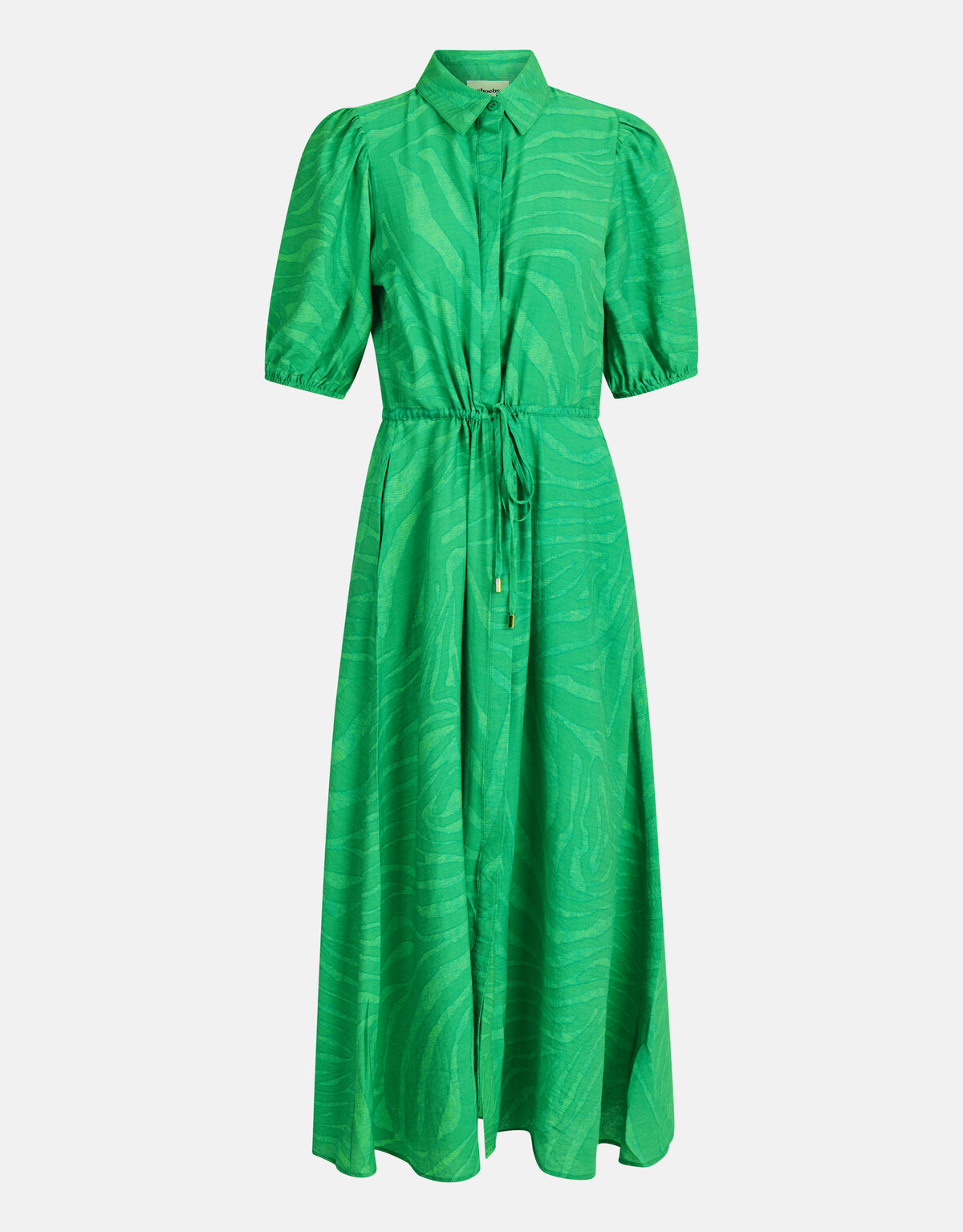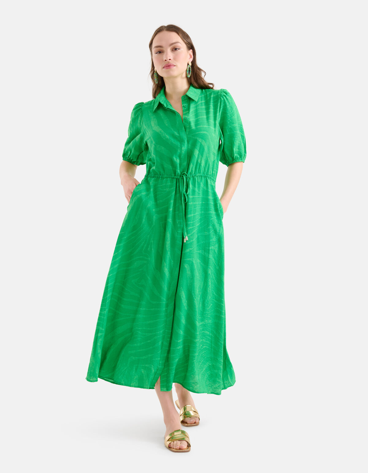 Vacation mode: On! De Zebra Print Maxi Jurk heeft een driekwart mouw, een kraag, een maxi-lengte, een uitlopend model, een knoopsluiting aan de voorzijde en een aansnoerkoord in de taille. Het item wordt gekenmerkt door de trendy groene kleur met een all-over zebra print in de stof verwerkt. Verder hebben de mouwen een elastieke band, waardoor de mouwen subtiel gaan poffen. De jurk is gemaakt van viscose en polyamide. Door deze samenstelling is het vormvast, kleurvast en sterk van kwaliteit. Maak de look compleet met een paar metallic sandalen en je bent good to go! Het model heeft een lengte van 173 cm en draagt maat S. Het artikel heeft een totale lengte van 130 cm bij maat S.