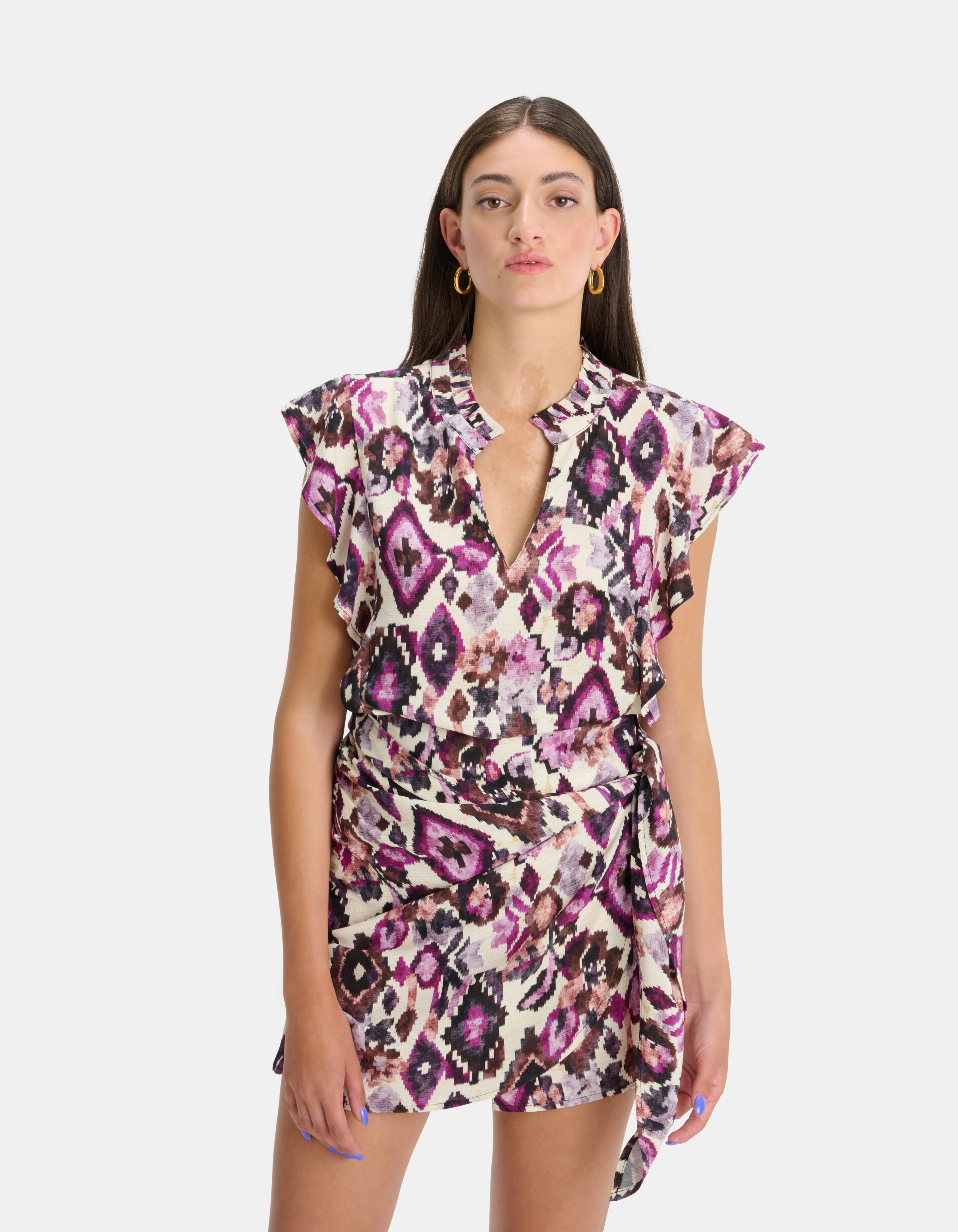 Spice up your wardrobe! De Coco Print Skort heeft een mini-lengte, een regular fit, een knoopsluiting aan de voorzijde en een elastieke band in de taille, om deze extra te accentueren. Het item wordt gekenmerkt door een witte kleur met een all-over grafische print in de kleur paars. Door de knoopsluiting aan de voorzijde lijkt het item een rokje, maar aan de achterzijde is het een short. Combineer het samen met de bijpassende top voor een complete set! Het model heeft een lengte van 174 cm en draagt maat S. Het artikel heeft een totale lengte van 46 cm bij maat S.