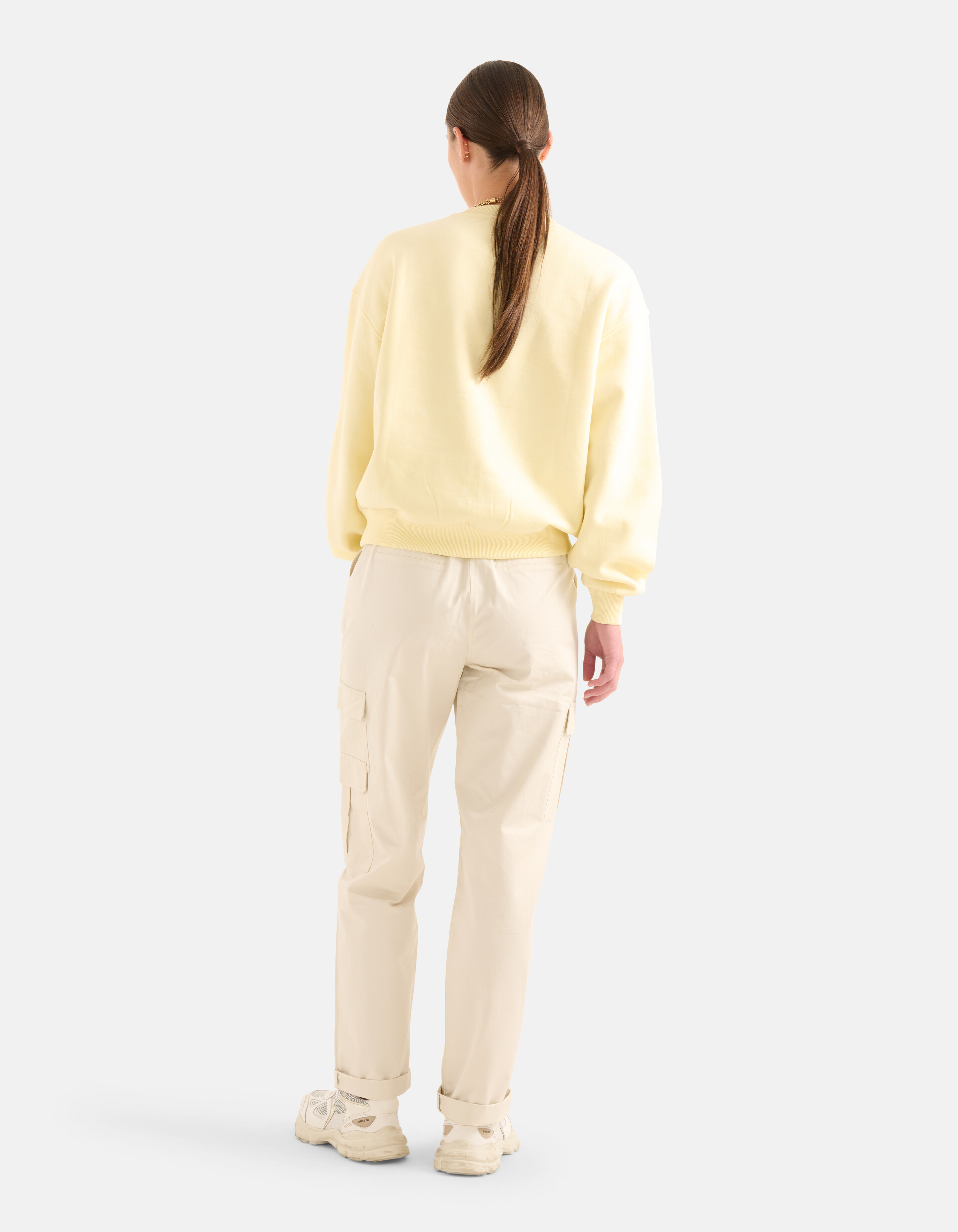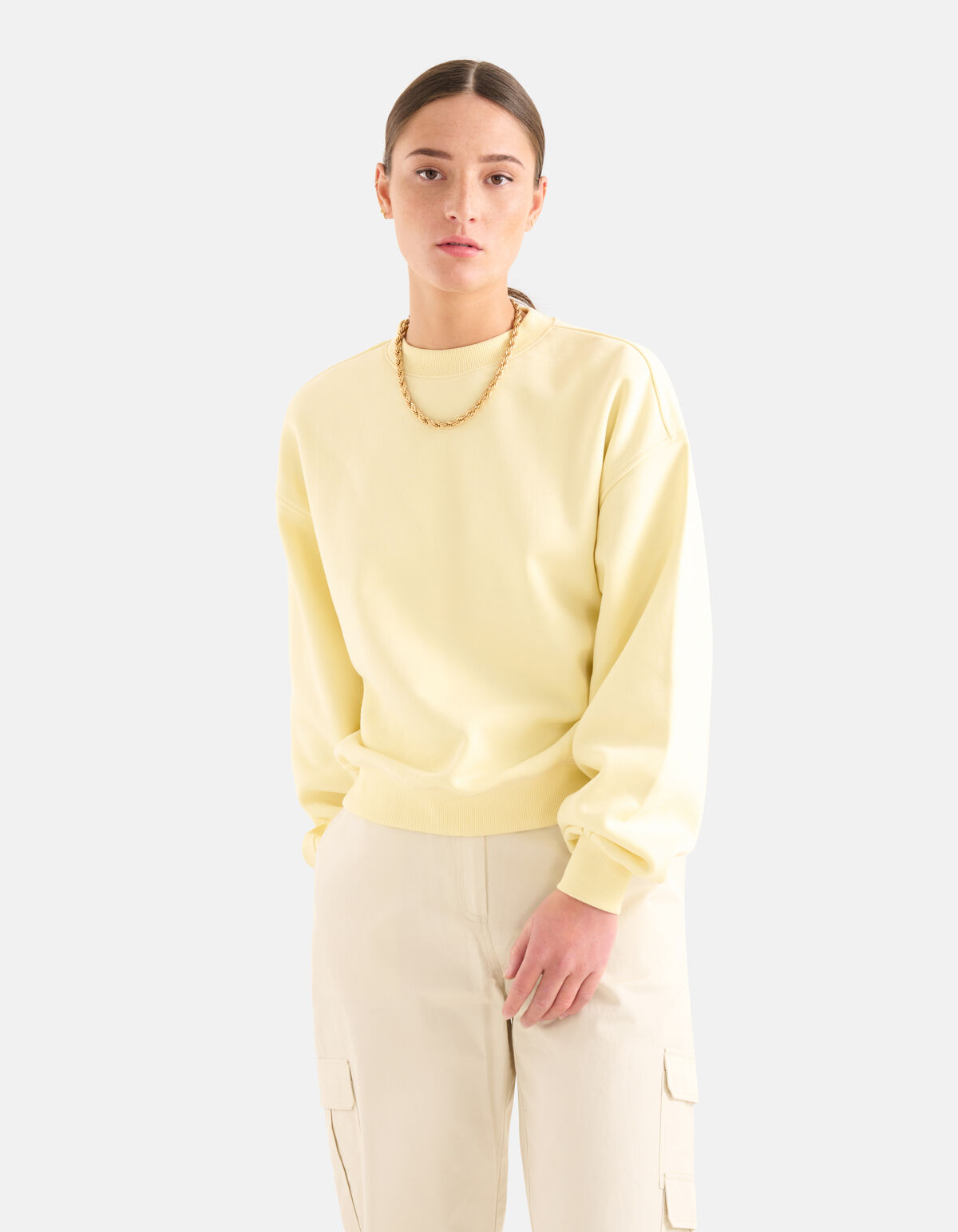 Color up! De Basis Sweater heeft lange mouwen, een hoge ronde hals en een oversized fit. Het item wordt gekenmerkt door een zachte sweat stof en een lichtgele kleur. De sweater heeft een brushed binnenkant, waardoor de trui super zacht aanvoelt. Verder heeft het item rib cuffs bij hals, onderzijde en mouwen. Maak de look compleet met een cargo broek, een paar chunky sneakers en een statement ketting! Het model heeft een lengte van 177 cm en draagt maat S. Het artikel heeft een totale lengte van 61 cm bij maat S.