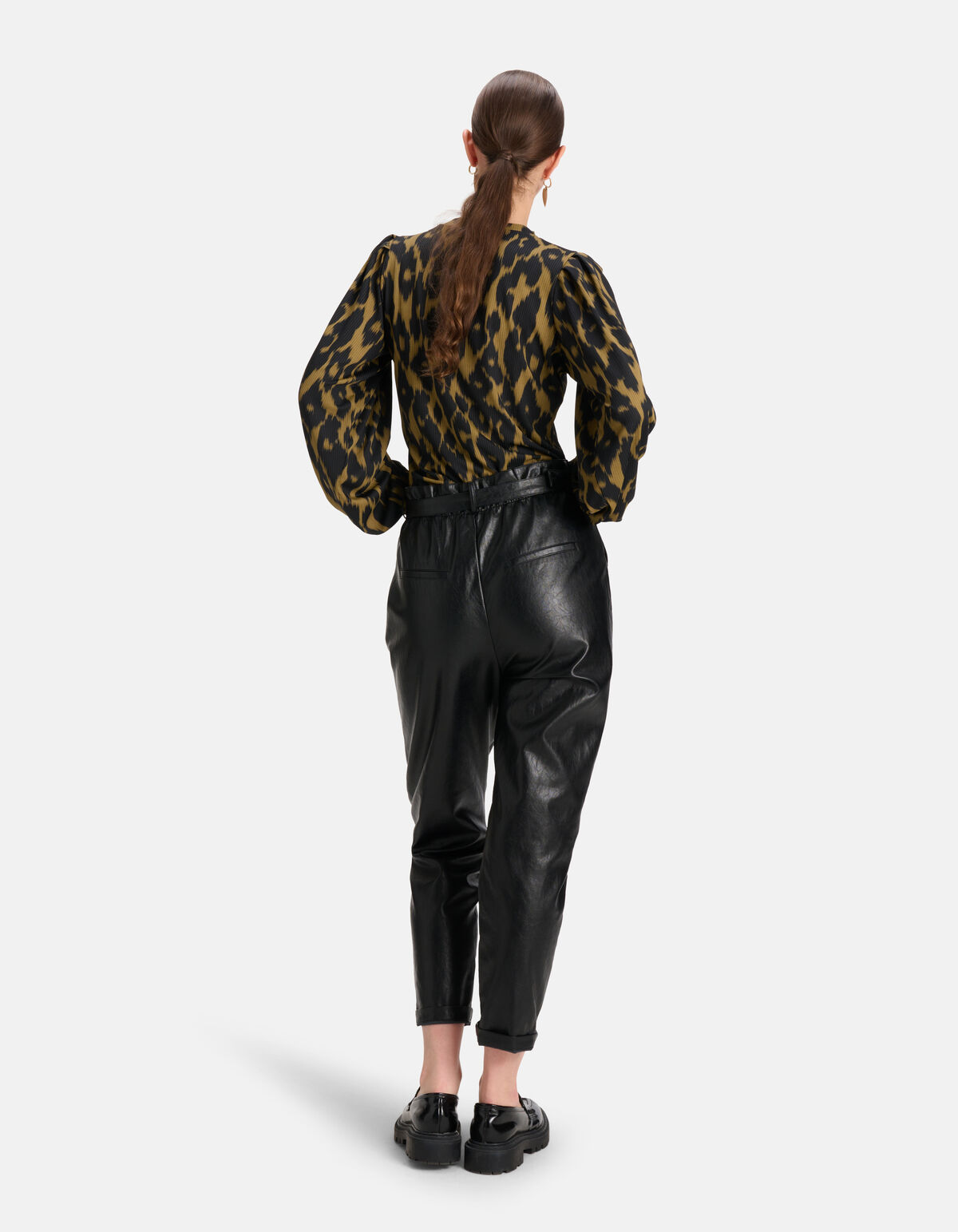 Casual meets stylish! De Leopard Rib Lange Mouwen T-shirt heeft lange mouwen, een hoge ronde hals en een regular fit. Het item wordt gekenmerkt door de wijde mouwen, de donkergroene kleur met een all-over leopard print en een jersey ribstof. Jersey zorgt ervoor dat het t-shirt extra lekker zit en fijn meerekt. Verder is het t-shirt gemaakt van polyester en elastaan, waardoor het strijkvrij en vormvast blijft. Combineer het samen met een vegan leren broek en loafers voor een stijlvolle look! Het model heeft een lengte van 179 cm en draagt maat S. Het artikel heeft een totale lengte van 64,5 cm bij maat S.
