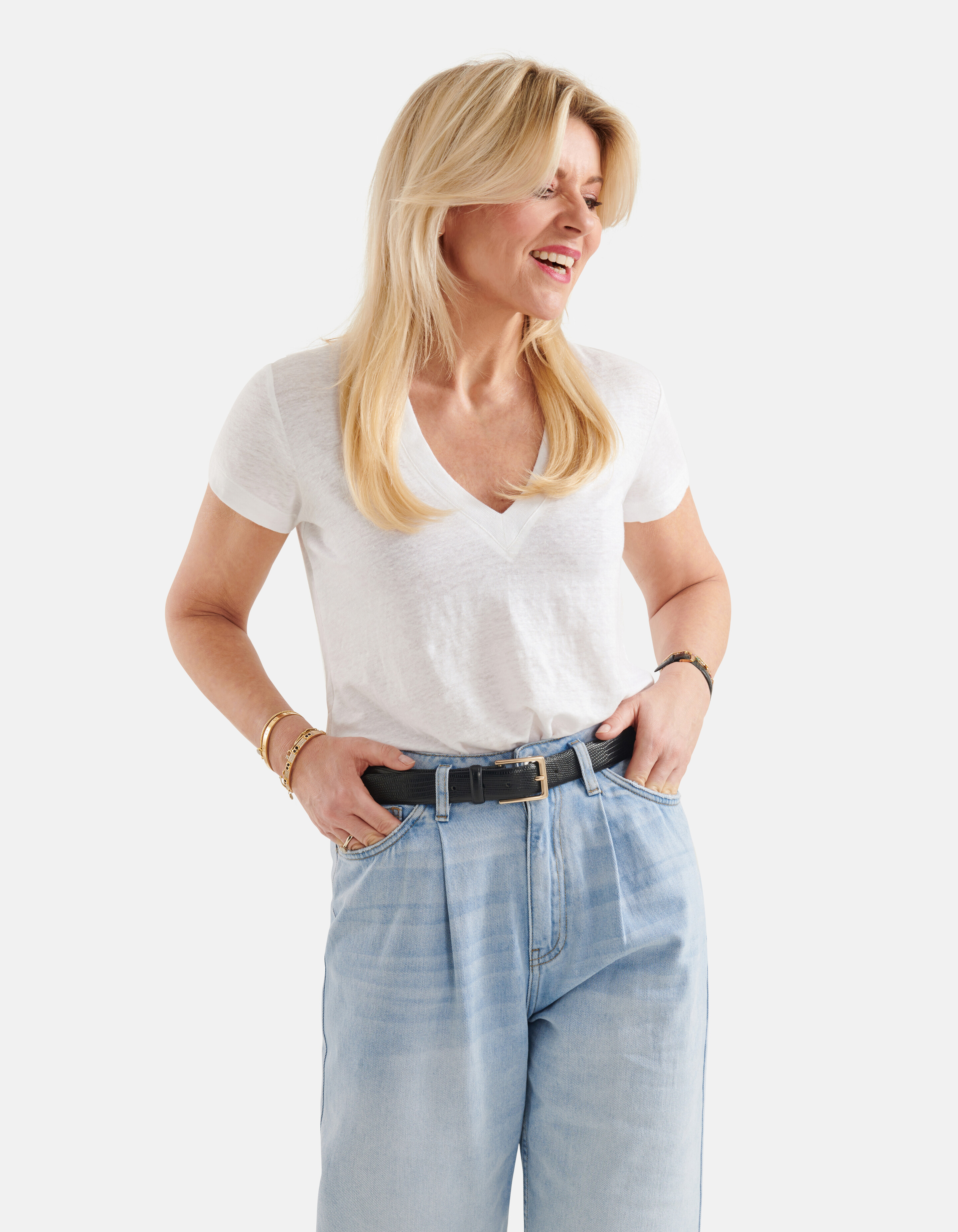 Het Linnen T-shirt heeft een korte mouw, een V-hals en een regular fit. Het item wordt gekenmerkt door luchtige stof en de witte kleur. Verder heeft het t-shirt een gouden Lonneke logo aan de onderzijde voor een luxueus effect. Met het t-shirt kan je dit voorjaar alle kanten op. Een leuk detail zijn de spleetjes aan de zijkanten. Het is gemaakt van linnen en elastaan, waardoor het grover van structuur is, subtiel mee rekt en gemaakt is van natuurlijk materiaal. Maak de look compleet met een wide leg jeans en een blazer voor een sophisticated look of combineer het chique met een maxi rok. Het model heeft een lengte van 174 cm en draagt maat XS/S. Het artikel heeft een totale lengte van 60 cm bij maat XS/S.