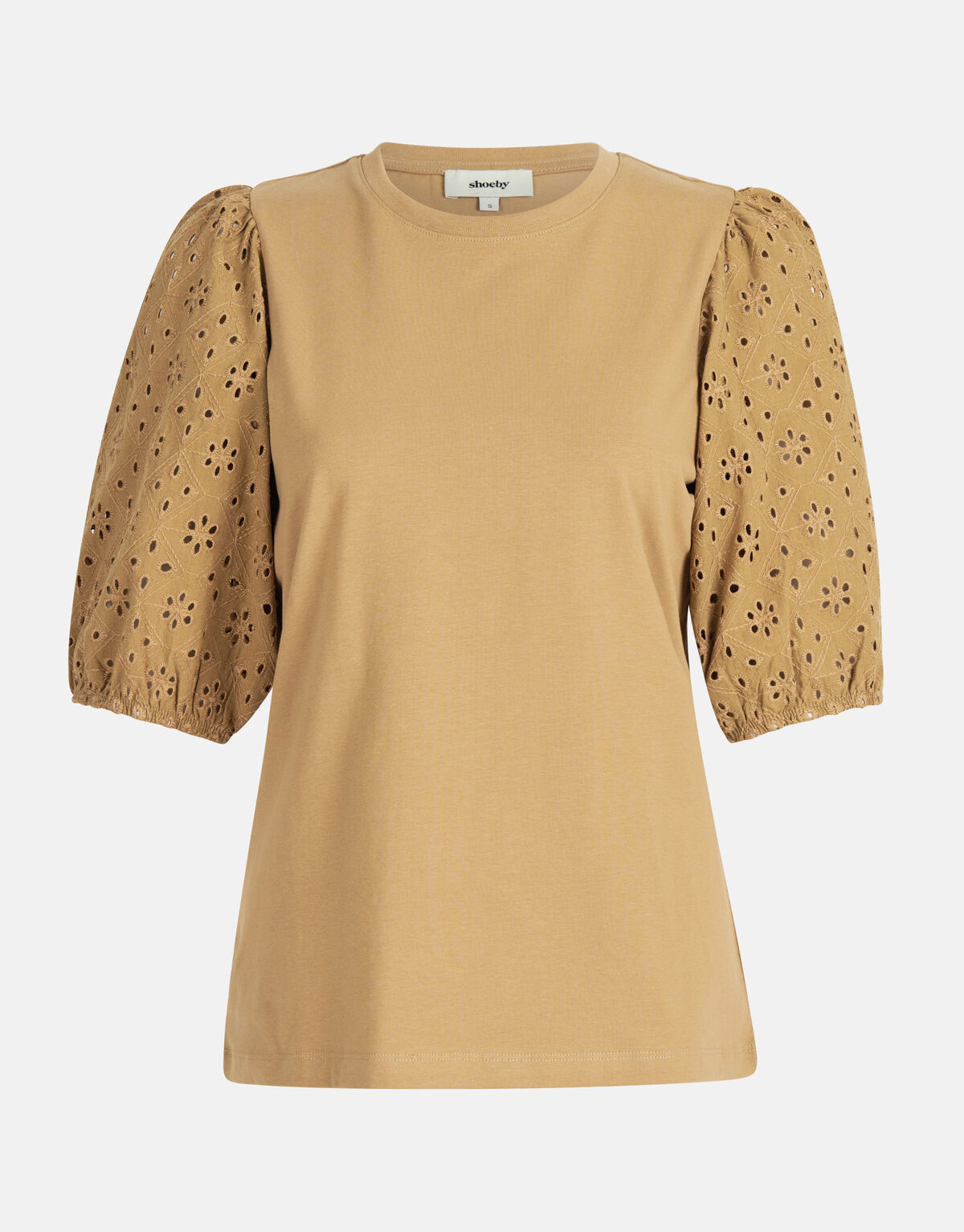 Iconic! De Embroidery Top heeft een driekwart pofmouw, een hoge hals en een regular fit. Het item wordt gekenmerkt door de beige zand kleur en de opengewerkte borduursels op de mouwen. Het is gemaakt van katoen en elastaan, hierdoor is het sterk van kwaliteit, rekbaar en draagt het comfortabel. Maak de look compleet met een barrel leg jeans en leopard sandalen. Het model heeft een lengte van 172 cm en draagt maat S. Het artikel heeft een totale lengte van 60,5 cm bij maat S.