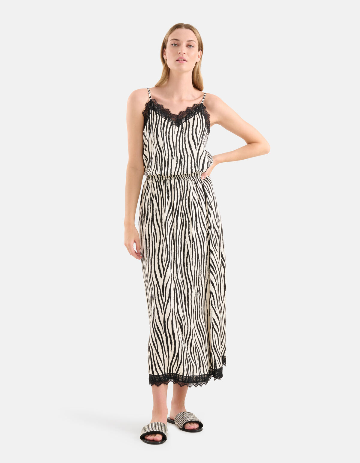 Your style passport to summer bliss! De Zebra Printed Singlet heeft een v-hals, verstelbare spaghettibandjes, non-stretch en een regular fit. Het item wordt gekenmerkt door de witte kleur met een all-over zebra print in de kleur zwart. Een leuk detail is de glanzende stof die net als satijn aanvoelt. Verder heeft het item kanten details aan de bovenzijde. Het is gemaakt van 100% viscose, hierdoor is het kleurvast en draagt het comfortabel. Maak de look compleet met de bijpassende midi rok en een paar sandalen of combineer het stoerder met een wide leg jeans voor een stijlvolle look! Het model heeft een lengte van 177 cm en draagt maat S. Het artikel heeft een totale lengte van 36,5 cm bij maat S.
