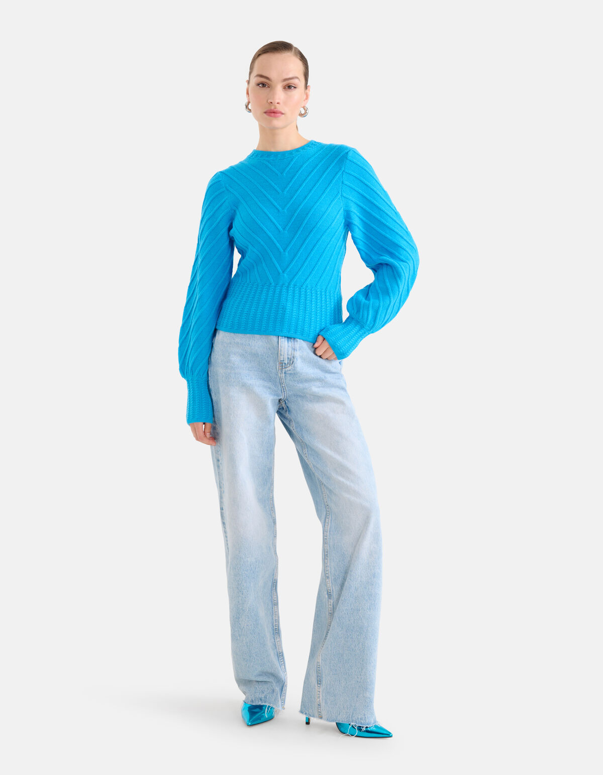 Blue, the color of endless possibilities! De Diagonaal Trui heeft lange mouwen, een ronde hoge hals, een stretch stof en een regular fit. Het item wordt gekenmerkt door de trendy blauwe kleur en de fijne gebreide stof. Verder heeft de trui all-over gebreide diagonale strepen in de stof. Het design in de trui geeft naast de prachtige kleur een extra wow effect! Daarnaast is de trui gemaakt van viscose, polyester en nylon, hierdoor heeft het een sterke kwaliteit, een goede pasvorm, vormvast, kleurvast en een comfortabele stof. Draag het samen met een wide leg jeans en een paar hakken voor een edgy look! Het model heeft een lengte van 173 cm en draagt maat S. Het artikel heeft een totale lengte van 54,5 cm bij maat S.