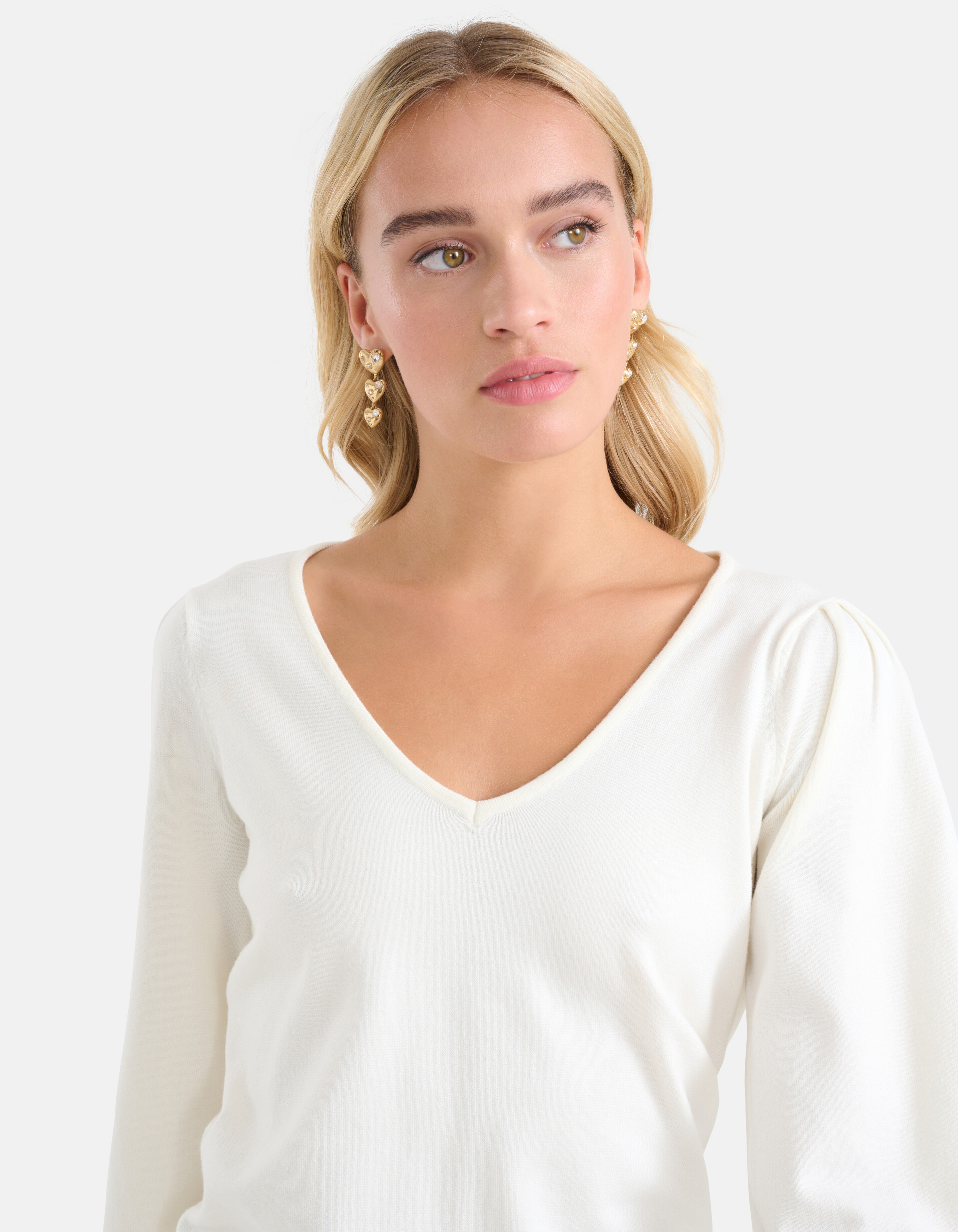 The perfect basic! De Gebreide V-hals Trui heeft lange ballonmouwen, een regular fit, een stretch stof en een v-hals. Het item wordt gekenmerkt door de gebroken witte kleur en de aansluitende boorden onderaan de mouwen. Verder is de trui gemaakt van viscose en polyamide, waardoor het comfortabel draagt en niet kreukt. Draag het samen met een coated legging en een paar hakken om de look compleet te maken. Het model heeft een lengte van 172 cm en draagt maat S. Het artikel heeft een totale lengte van 60 cm bij maat S.