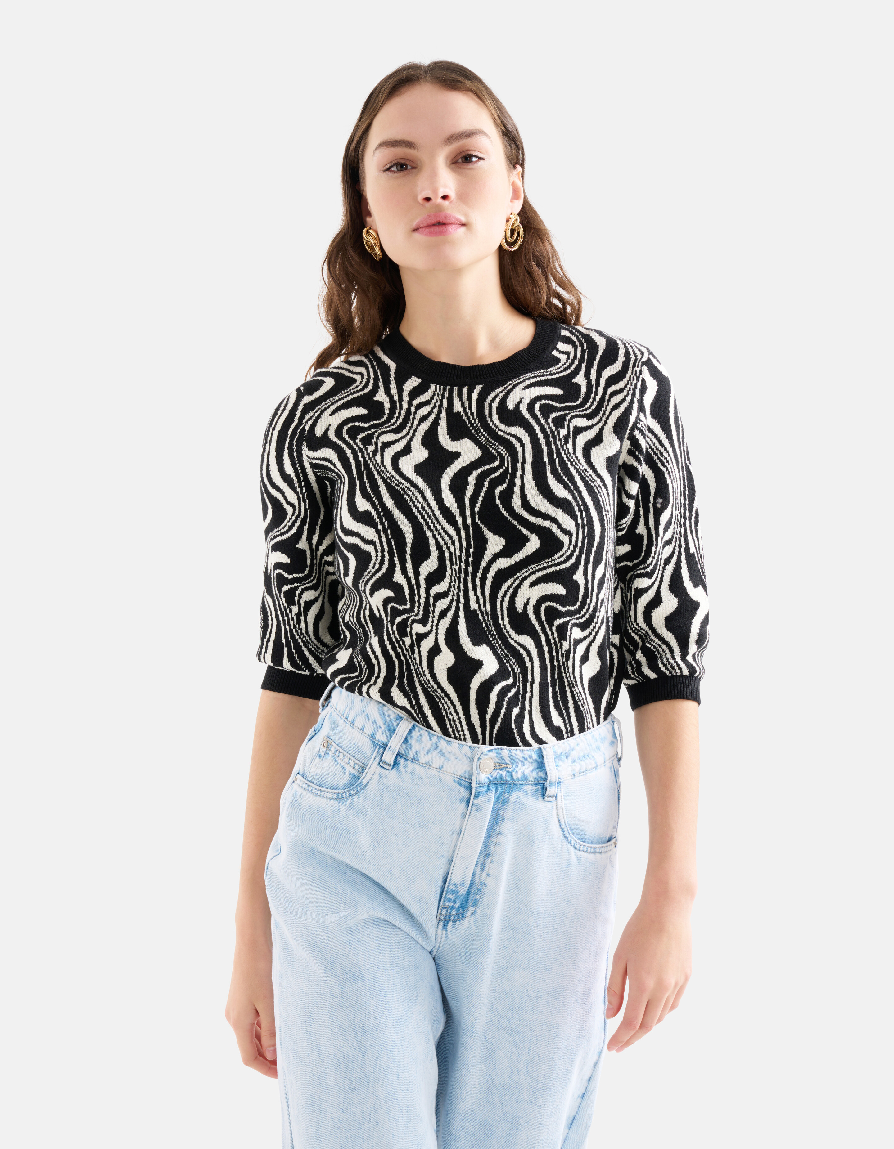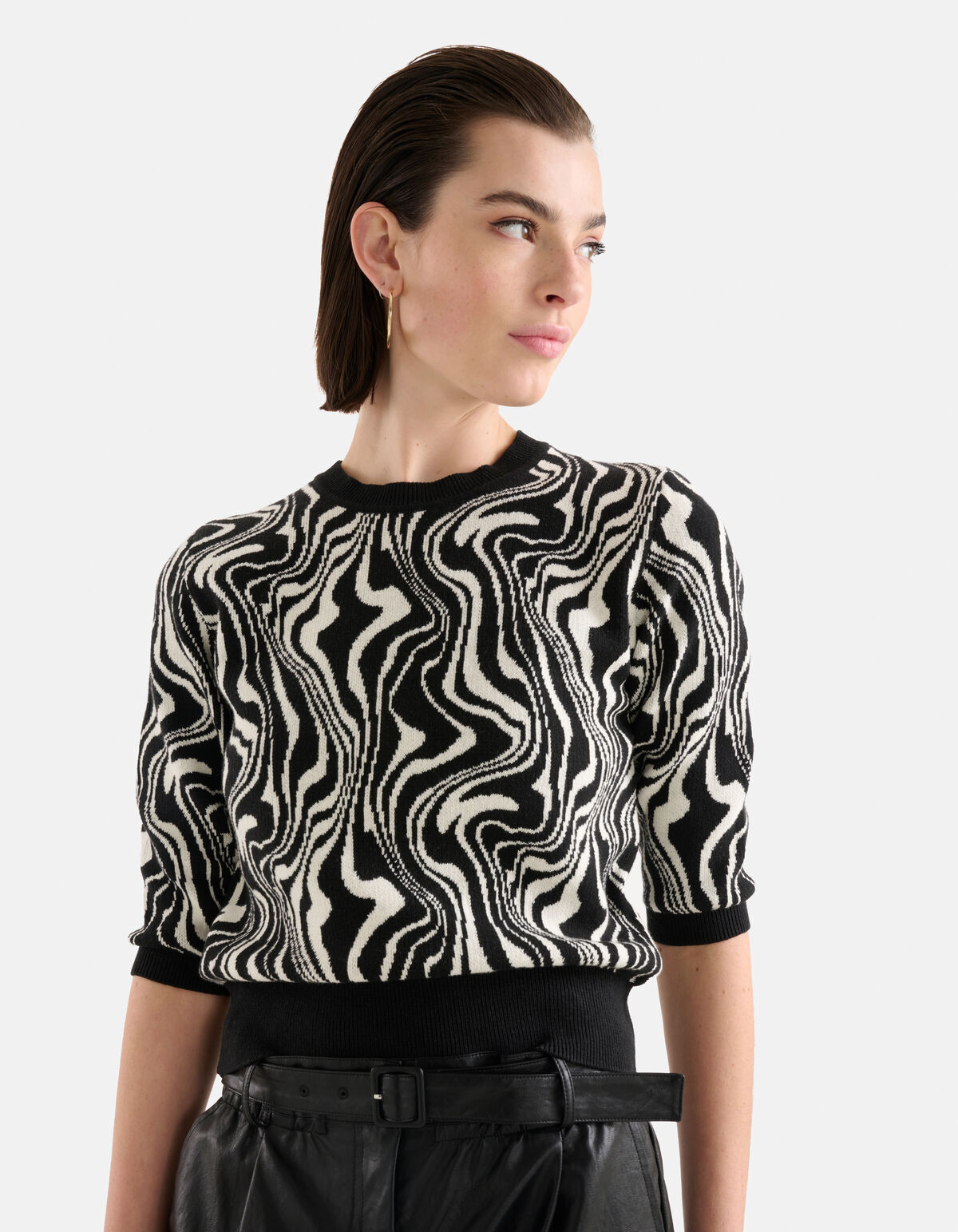 Trending! De Jacquard Swirl Trui heeft korte mouwen, een hoge ronde hals en een aansluitende fit. Het item wordt gekenmerkt door de gebreide stof, de gebroken witte kleur met een all-over swirl print in de kleur zwart. De jacquard print is in de stof geweven, waardoor het een luxueus effect heeft. Het is gemaakt van 100% katoen, hierdoor draagt het comfortabel en is het sterk van kwaliteit. Combineer het samen met een denim jeans en hakken voor een sophisticated look! Het model heeft een lengte van 177 cm en draagt maat S. Het artikel heeft een totale lengte van 51,5 cm bij maat S.