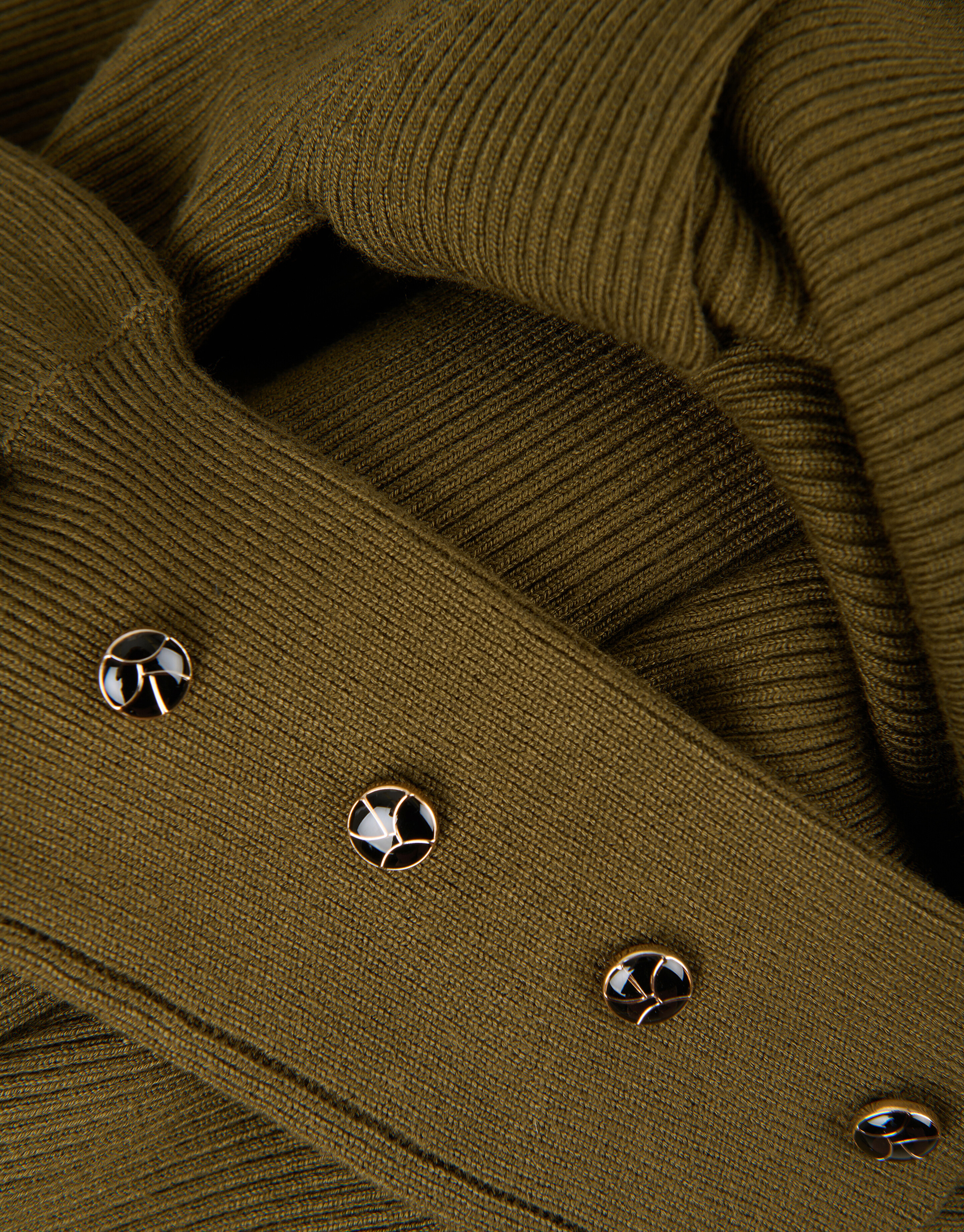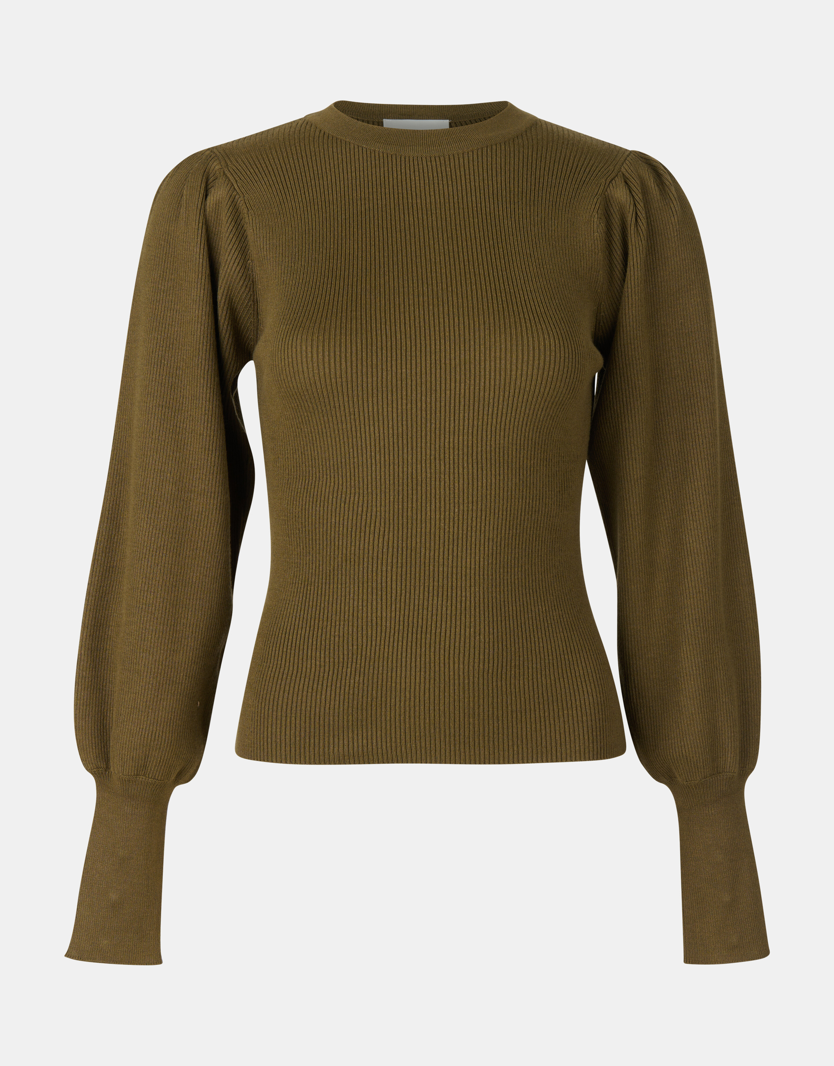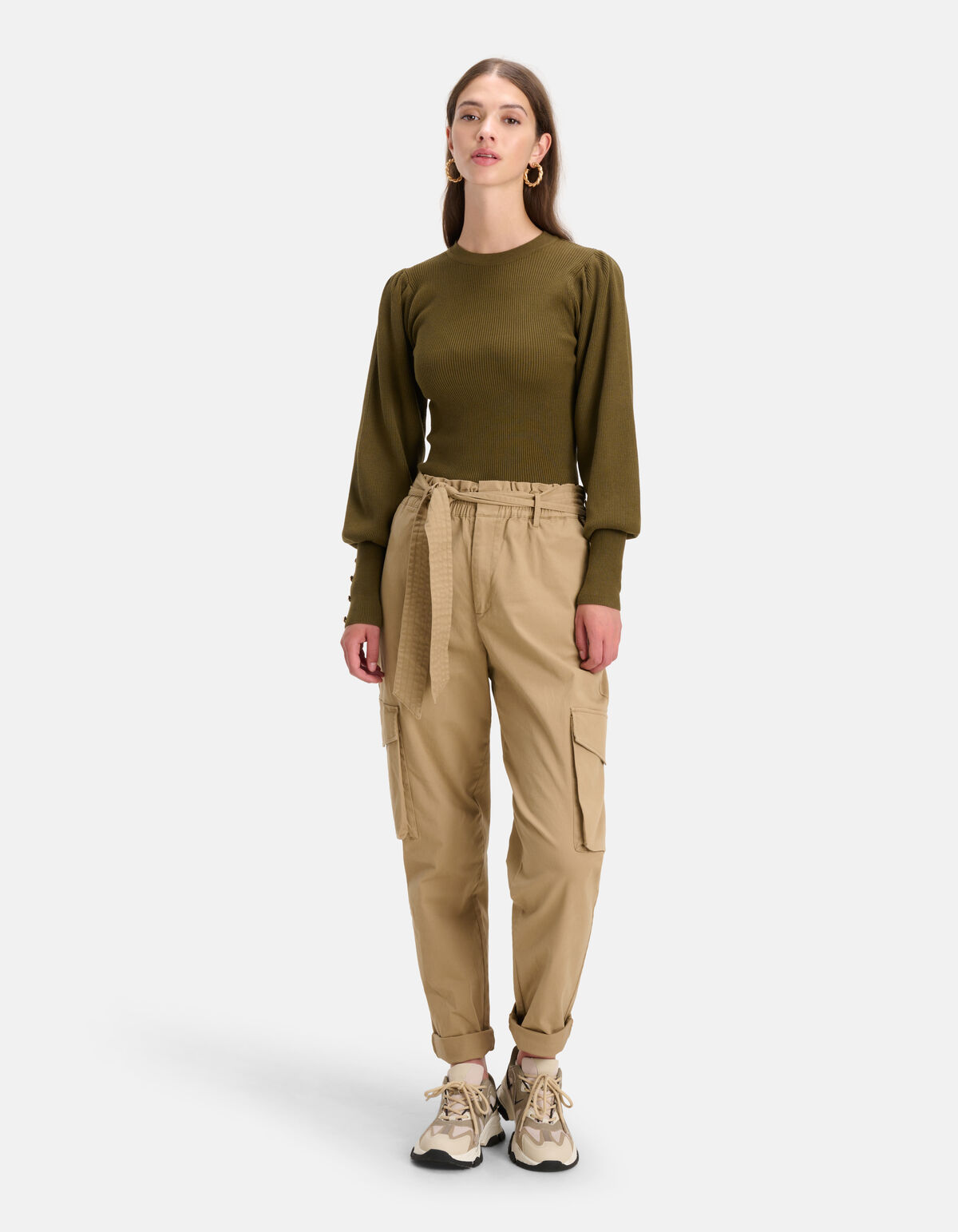 The greener the better! De Rib Trui heeft lange pofmouwen, een ronde hals en een aansluitende fit. Het item wordt gekenmerkt door de donkergroene kleur en een rib detail in de stof. Verder hebben de mouwen elastiek aan de onderzijde met vier decoratieve knopen. Het is gemaakt van viscose en nylon, waardoor het item fijn draagt, kleurvast en sterk van kwaliteit is. Combineer het samen met een stoere cargo broek en sneakers voor een sportieve look. Het model heeft een lengte van 179 cm en draagt maat S. Het artikel heeft een totale lengte van 54 cm bij maat S.